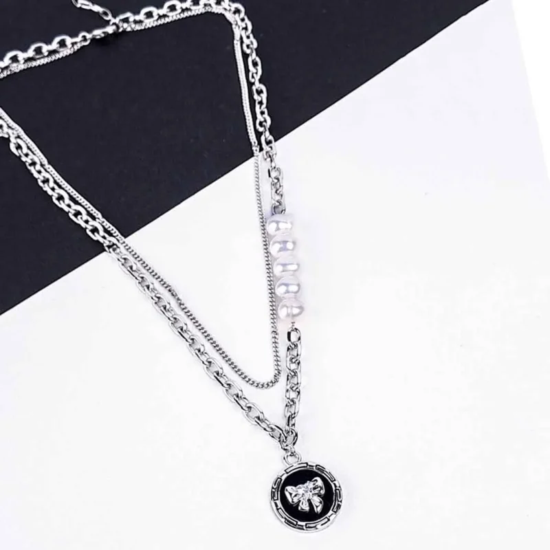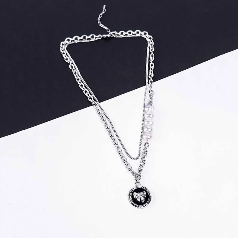 Chic Silver Black Bow And Pearl Layered Necklace