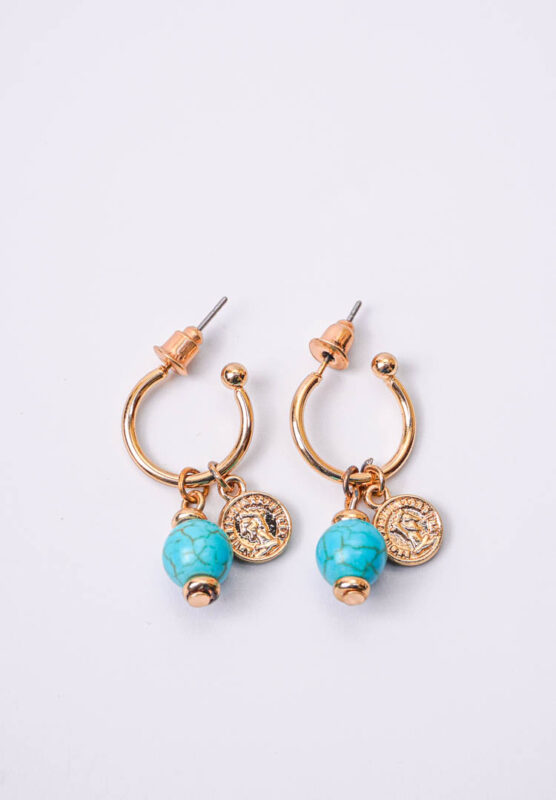 Beaded Turquoise Coin Charm Circular Hoop Earrings