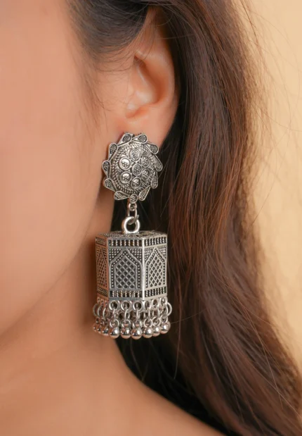 Original price was: ₹399.00.₹249.00Current price is: ₹249.00. Incl. all taxesOxidised Small Triangular Jhumka Earrings