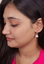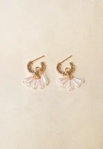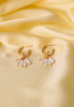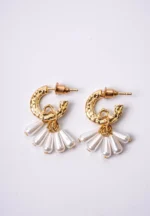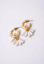 Mini c hoop earring with texturted golden tone/pearl white finish featuring dangling teardrop shaped acrylic pearl charms and a push back closure