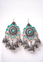 Geometric floral shaped jhumka earring with oxidised silver-tone finish adorned with turquoise and creme coloured enamel inlay and dangling dome shaped designs with intricate detailing and ghungroos at the bottom with a french hook closure