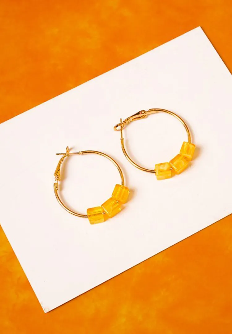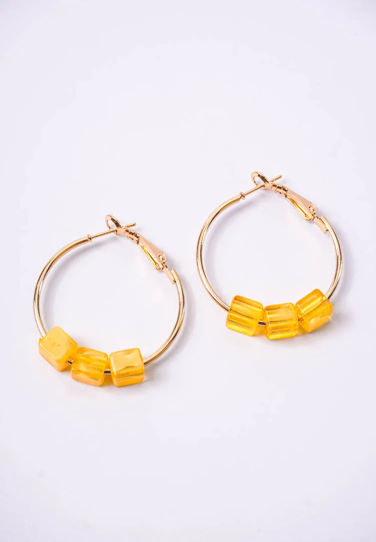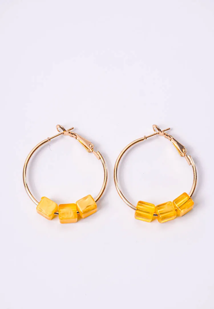 Metal hoop earring with golden tone/cadmium yellow finish featuring three translucent yellow cube-shaped beads evenly spaced along the bottom with a hinged back