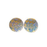 Circular brass drop earring embellished with an intricate blue floral pattern design and a push back post