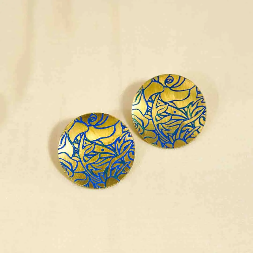Circular brass drop earring embellished with an intricate blue floral pattern design and a push back post