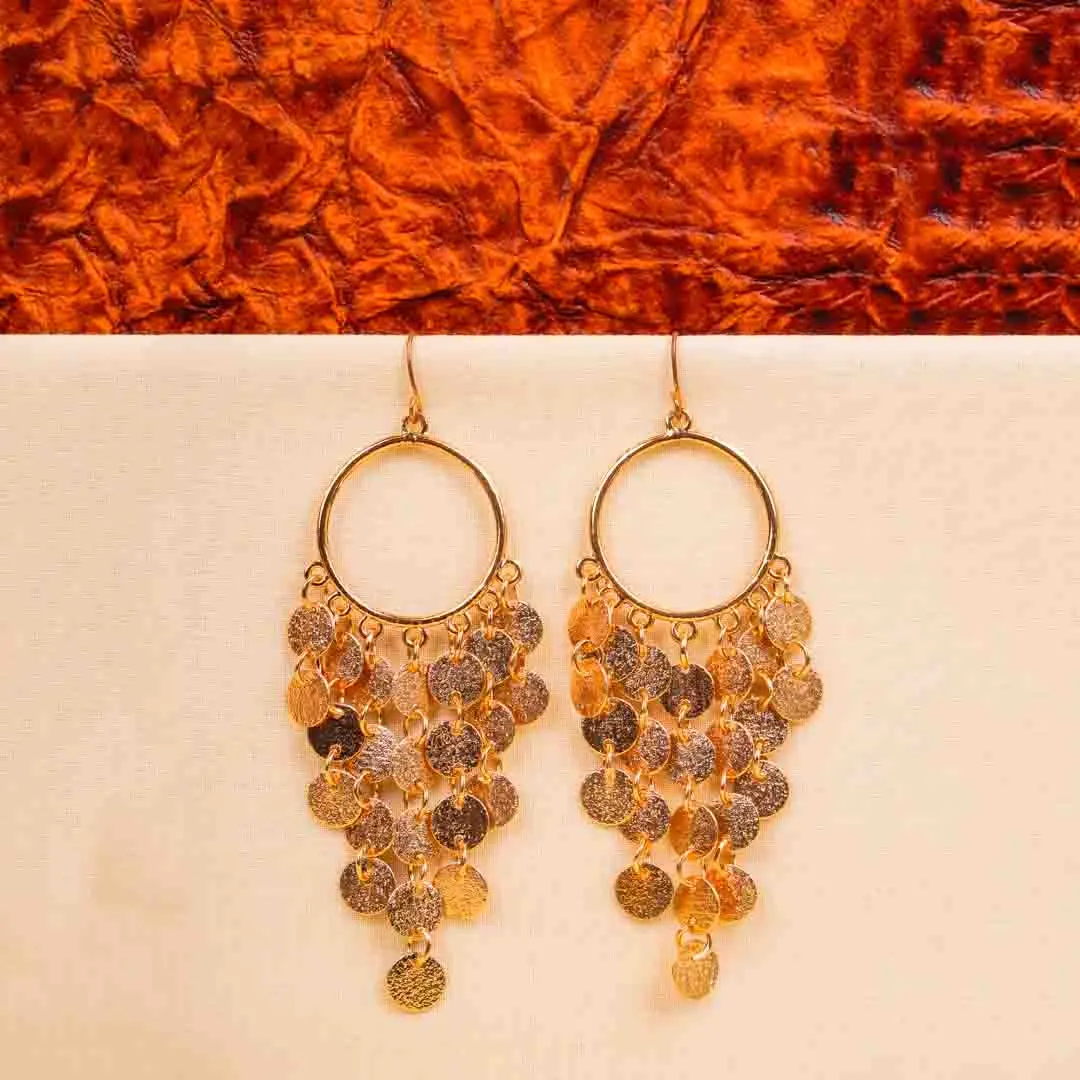 Metal hoop earring with antique golden/silver finish featuring dangling small textured coin-like disc arranged in a cascading layered pattern with french hook closure
