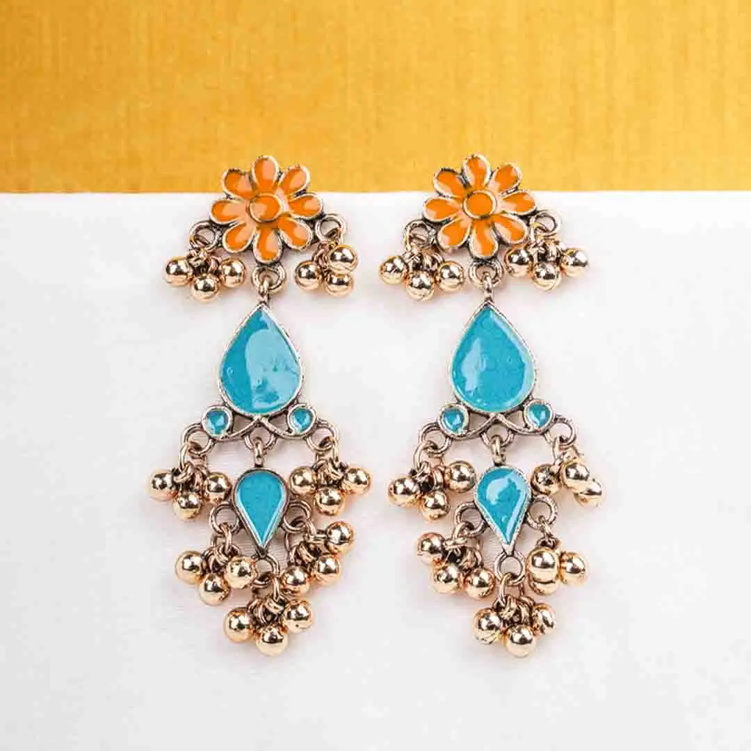 Metal dangle earring with coloured flower shaped top and antique gold-tone finish featuring teardrop shaped designs with coloured enamel inlay adorned with ghungroos and a push back post