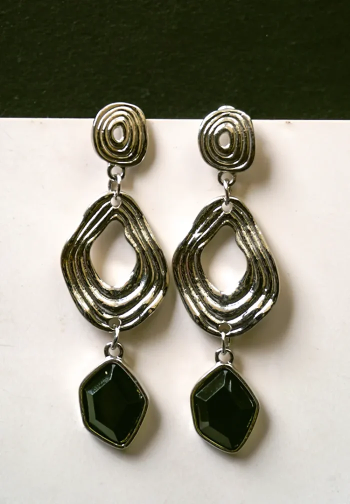 Asymmetrical spiral shaped dangle metal earring with a coloured hexagon shaped gemstone drop at the bottom and push back closure