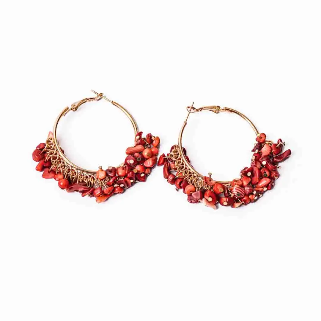 Metal hoop earring with golden tone/crimson red finish featuring reddish-orange stone beaded fringe and a hinghed back