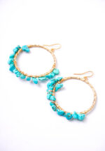 Golden tone textured hoop earring featuring small turquoise coloured polished stone beads and a french hook