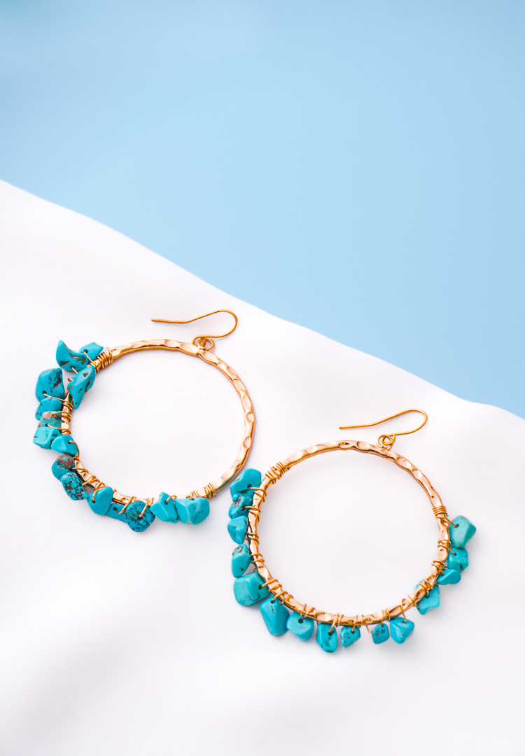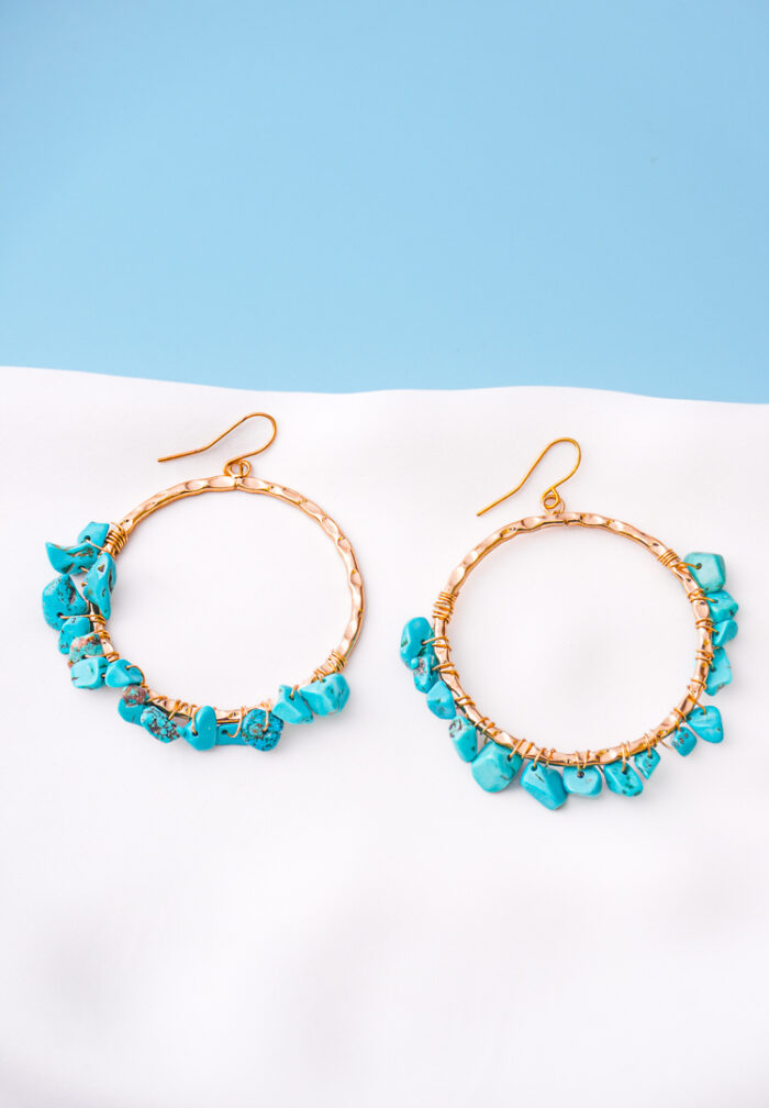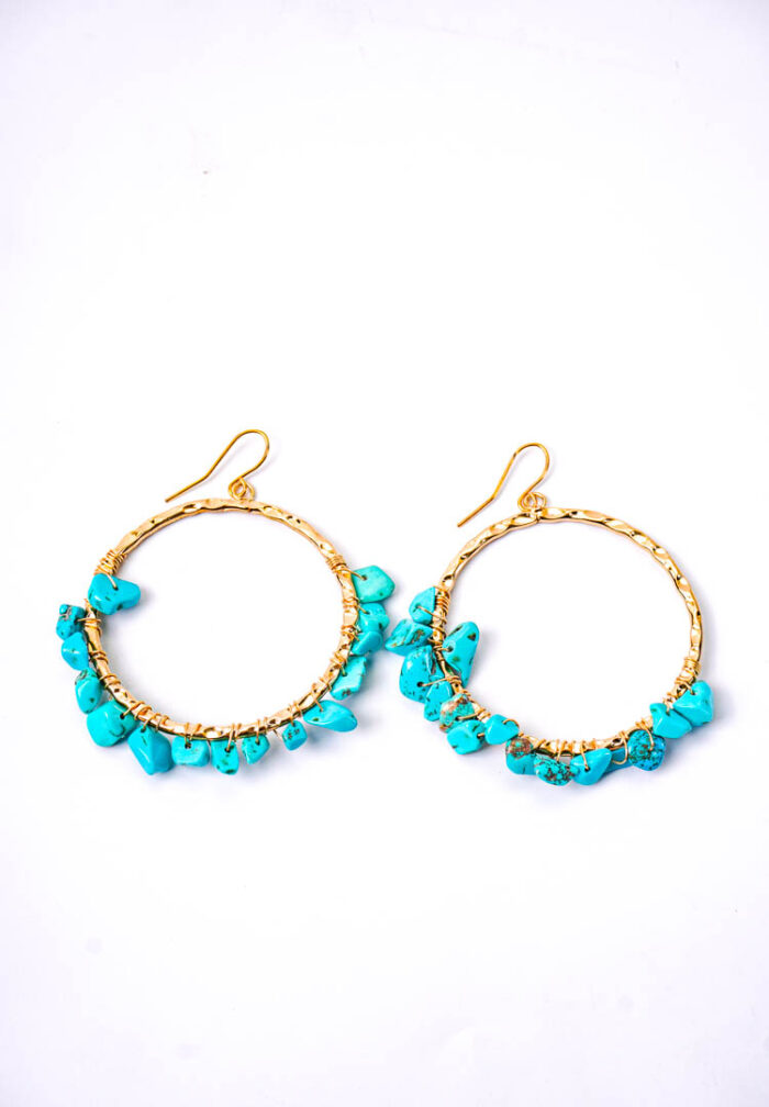 Golden tone textured hoop earring featuring small turquoise coloured polished stone beads and a french hook