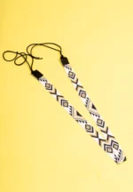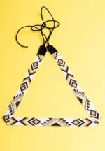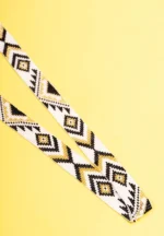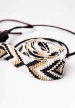Geometric patterned seed bead belts featuring alternating gold black and white coloured geometric shapes and dori closure