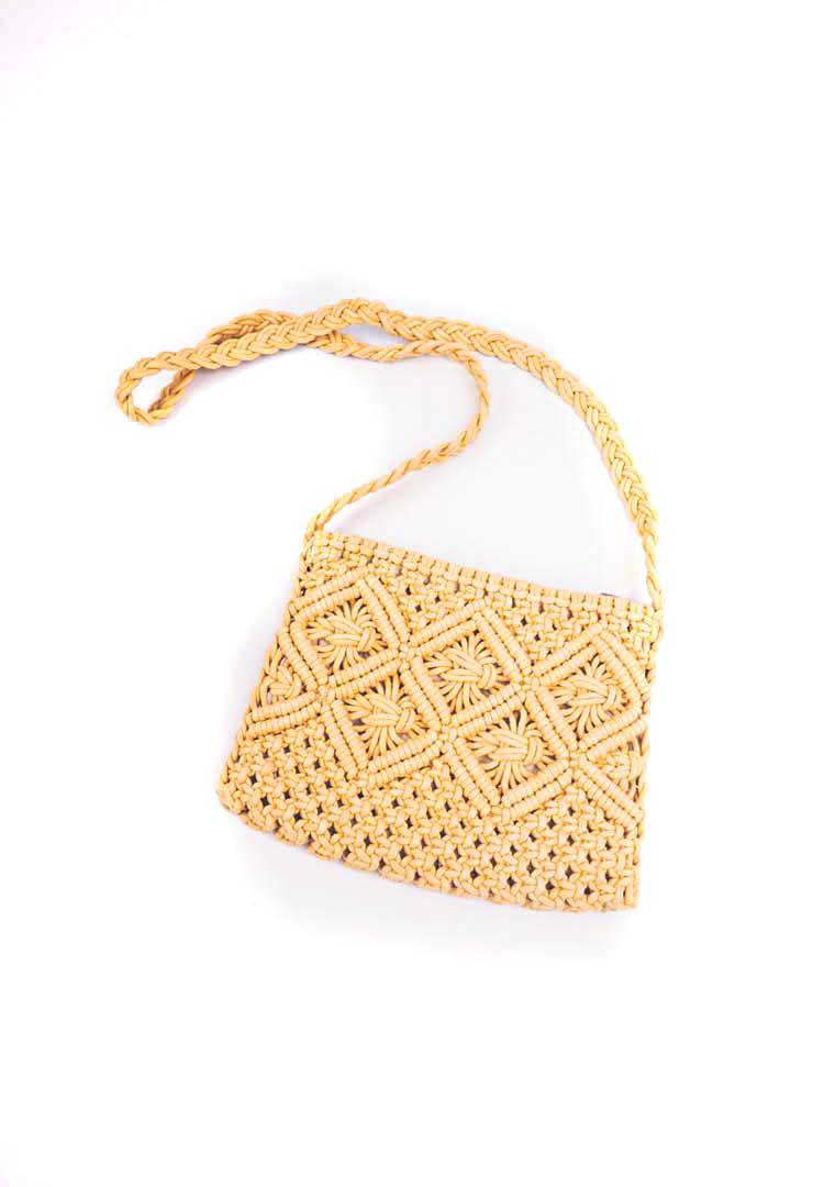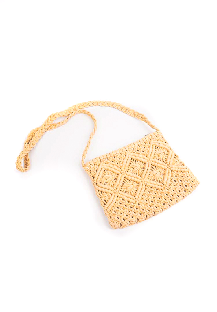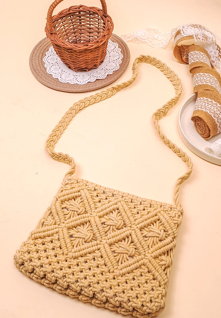 Macrame sling bag in a natural beige color featuring a textured and intricate knotted pattern with a zipper lock
