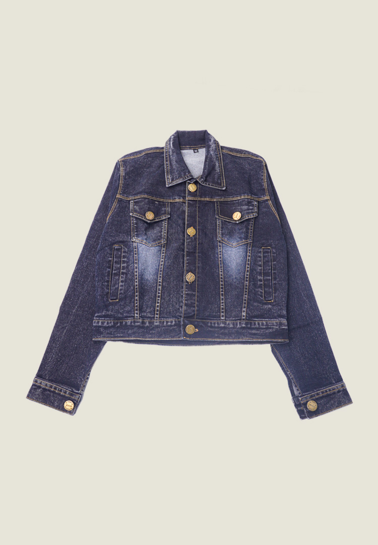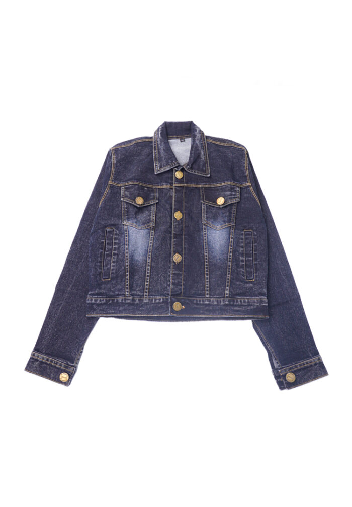 Classic colour name cropped denim jacket featuring details like a button-up front, regular collar, full sleeves and flap pockets. The cropped denim is a structured flattering fit. A perfect casual cool look. It pairs well with every outfit with its easy to go style and adds versitality.