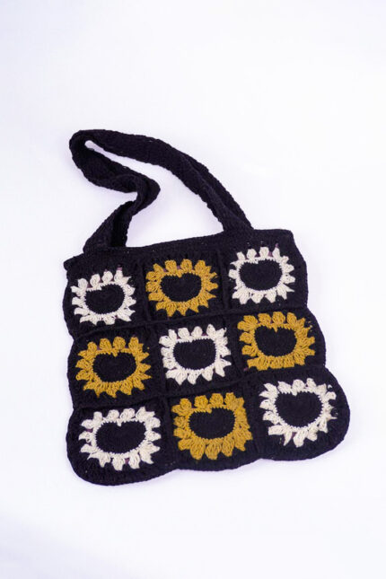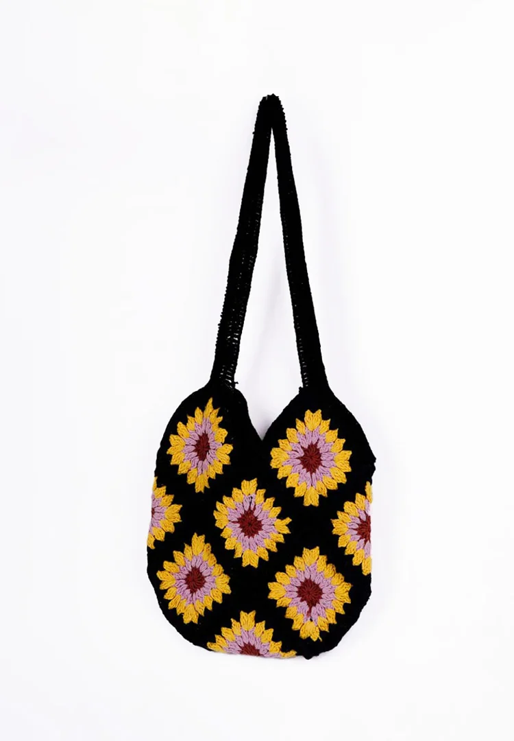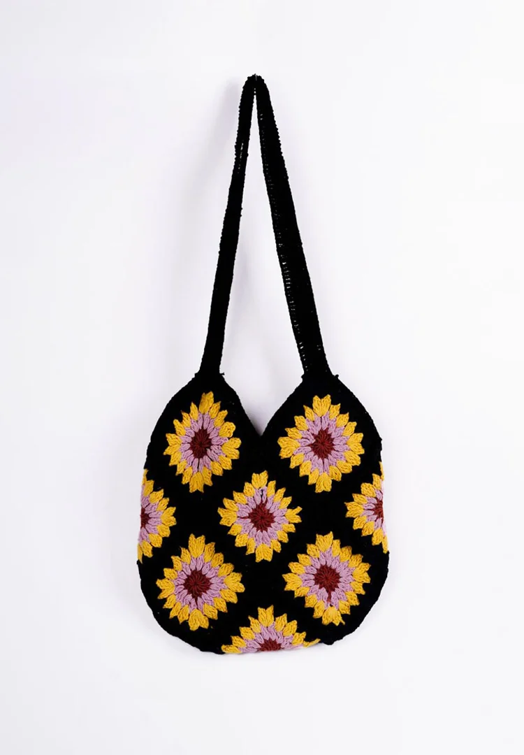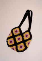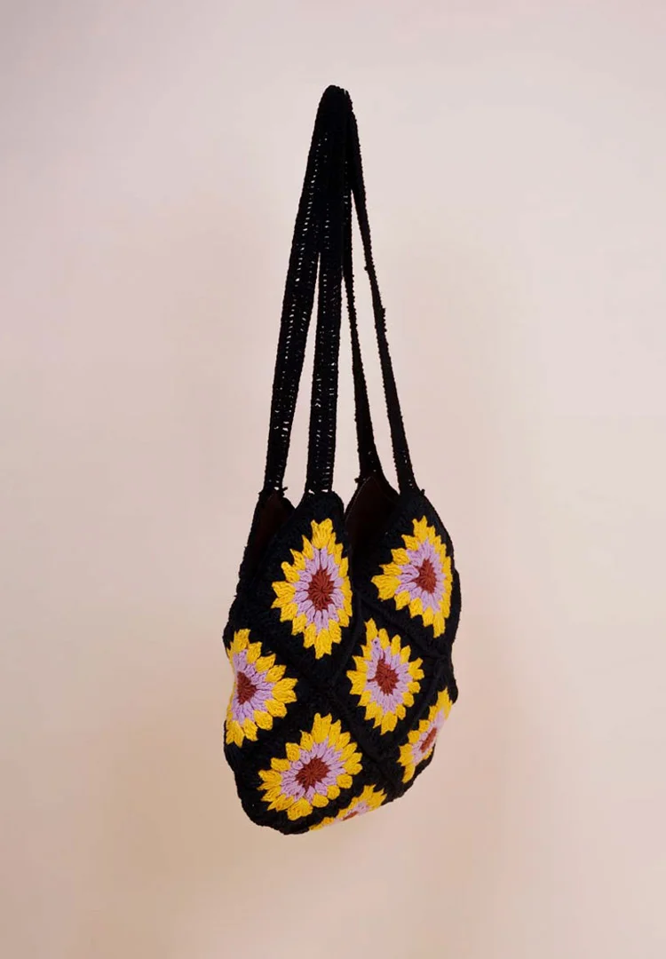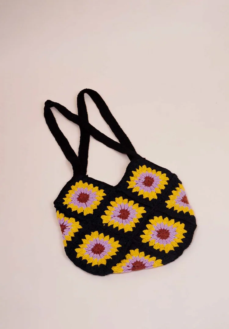 Crochet bag with a striking sunflower-inspired granny square patterns featuring a black base with floral motifs in shades of yellow, lilac, and brown creating a vibrant yet elegant contrast with two sturdy crochet straps and a magnetic lock