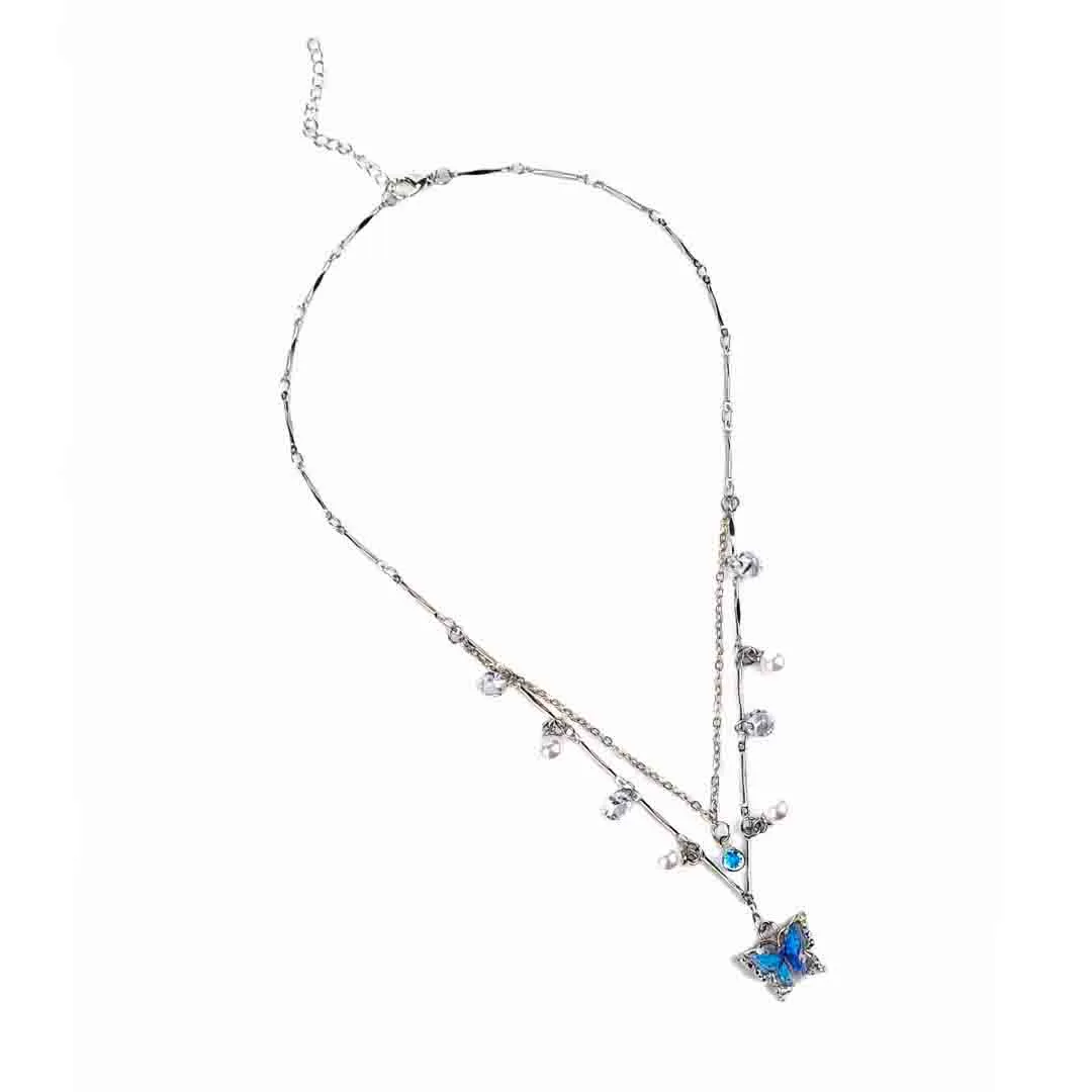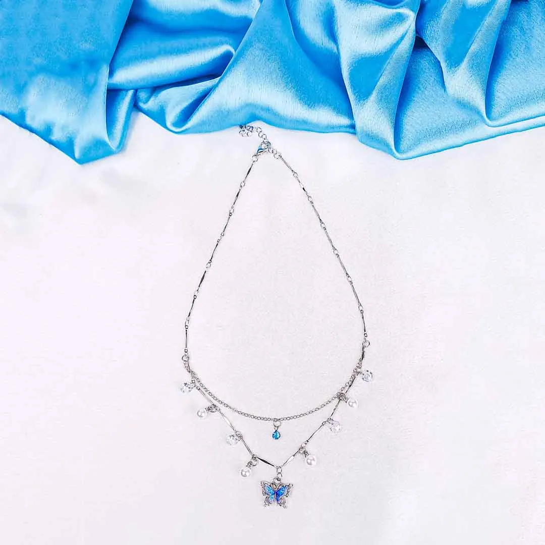 Embrace elegance with a hint of whimsy in our Blue Butterfly Charm Double Layered Necklace. Designed with two delicate silver chains, this piece beautifully layers to create a graceful, effortless look. The first layer features subtle crystal and pearl charms, while the second showcases a mesmerizing blue butterfly pendant that captures the essence of transformation and beauty.