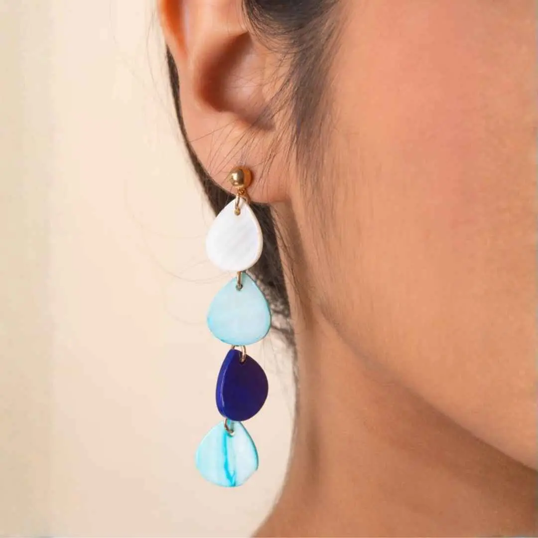 Golden round stud top dangle earring with Tear drop shaped acylric in white and hues of blue and a push back closure