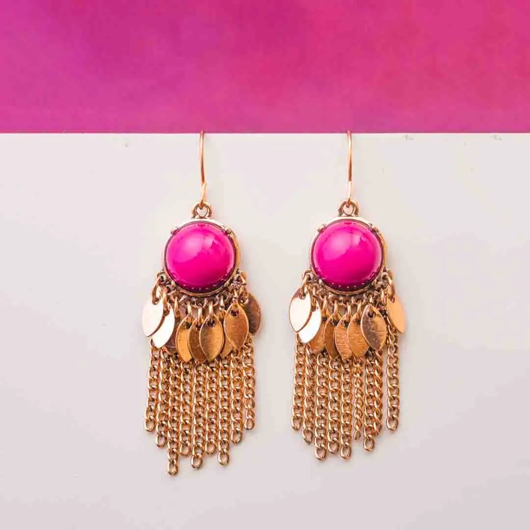 Metal dangle earring with gold-tone finish featuring a circular purple coloured stone adorned with a series of leaf shaped charms and delicate chain tassels with a french hook closure