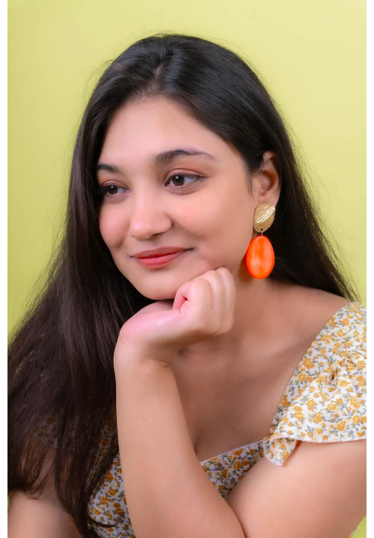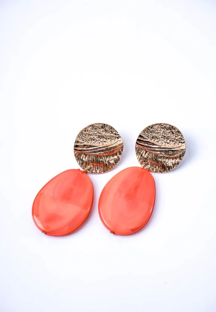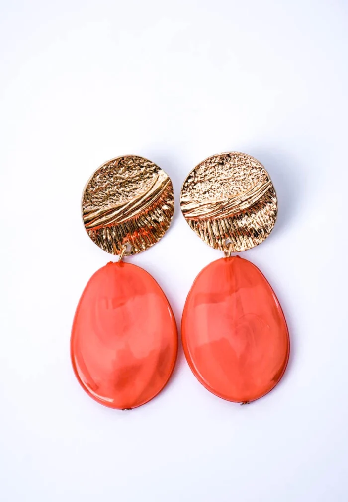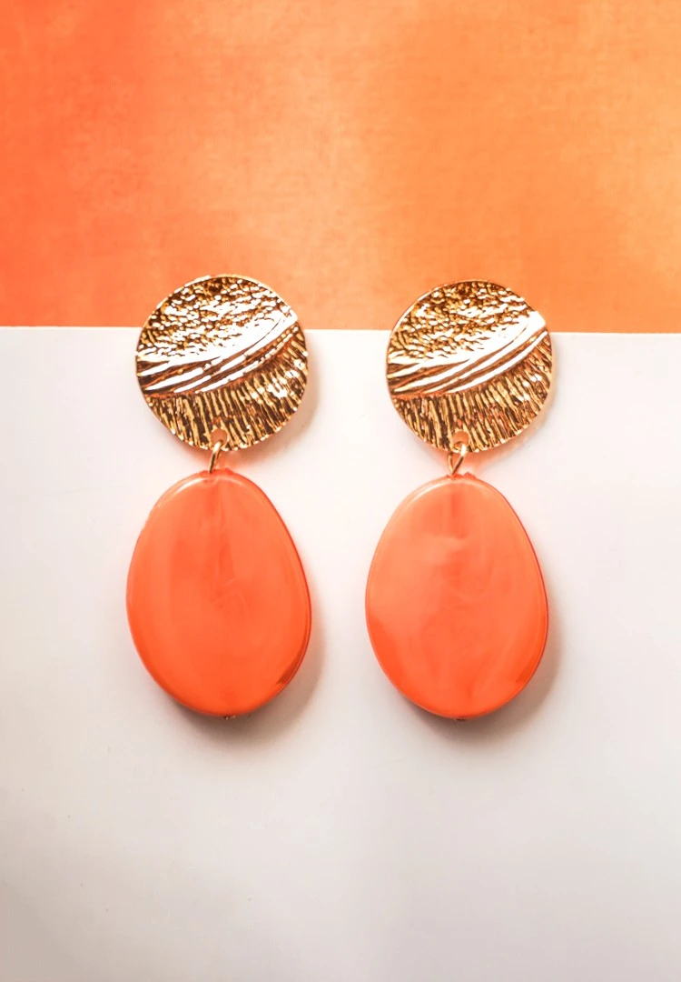 Bright orange acrylic dangle earring with a matte finish and gold textured top with push back closure