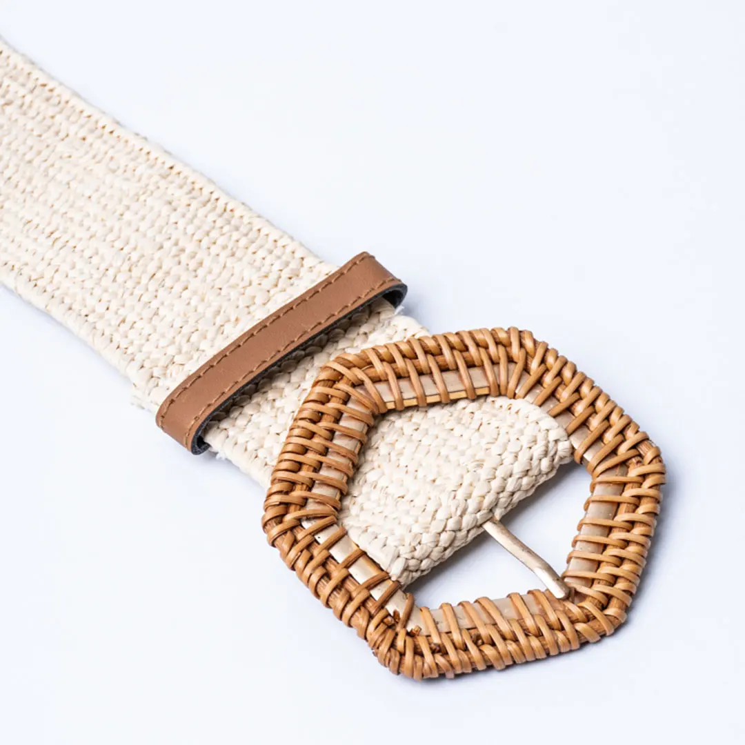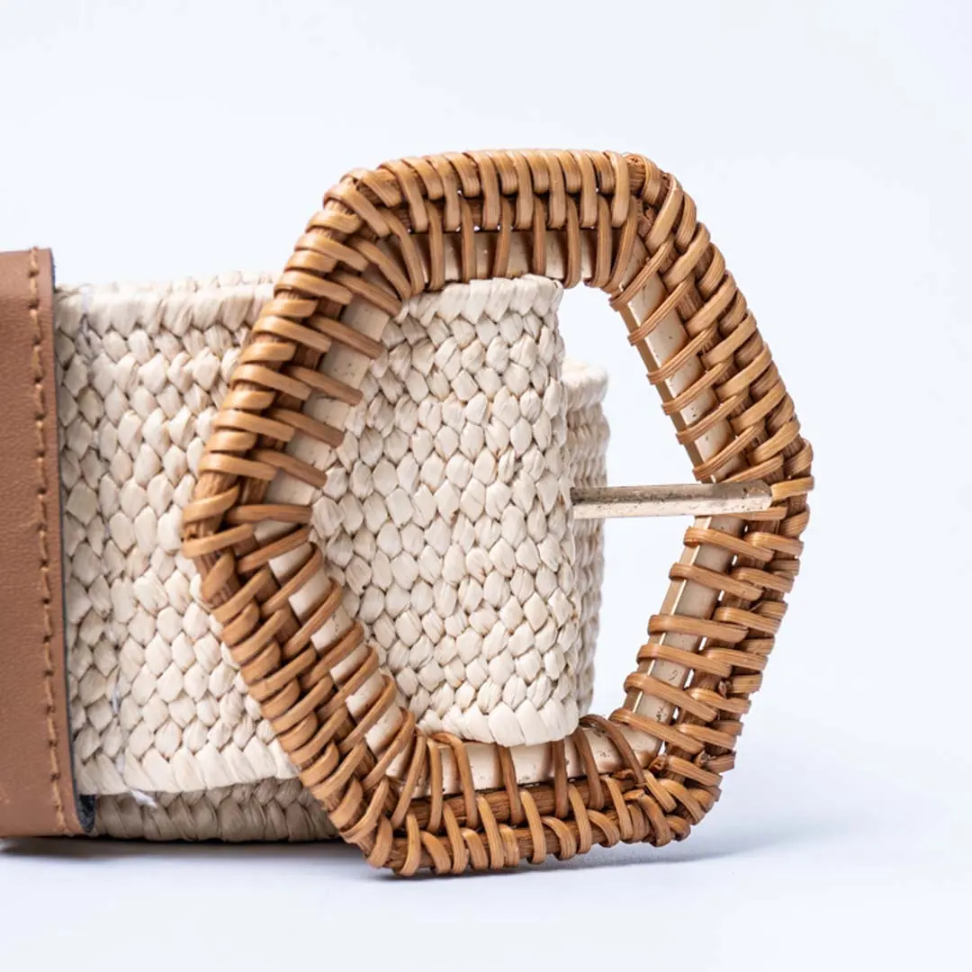 Braided Cream Raffia Hexagonal Buckle Belt