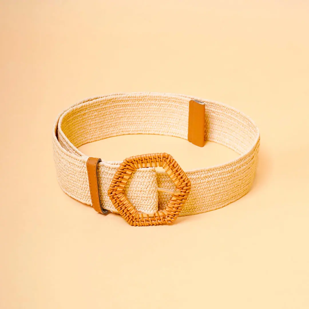 Textured woven straw belt in cream colour featuring a woven geometric hexagon shaped buckle