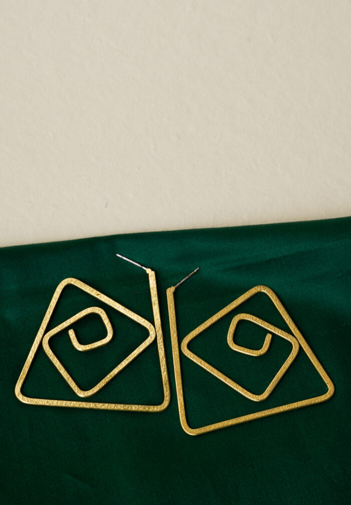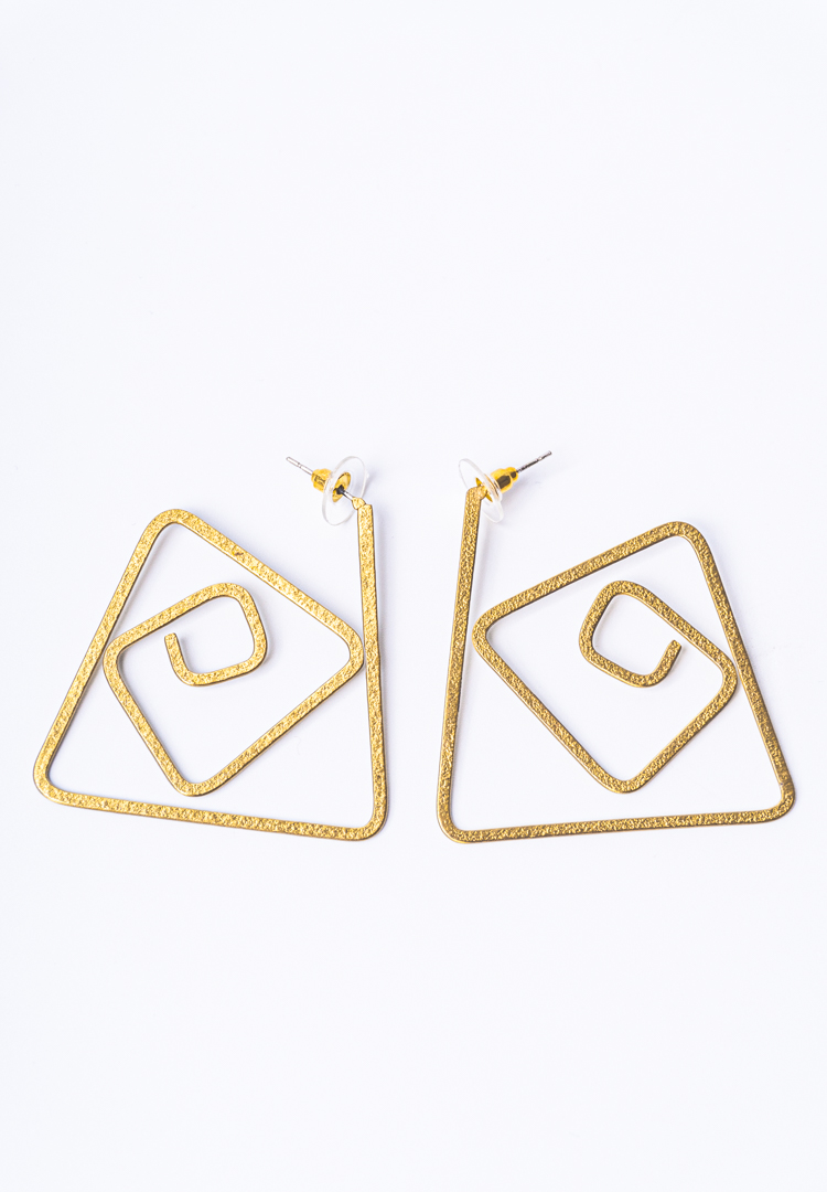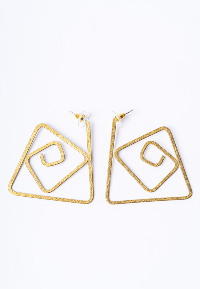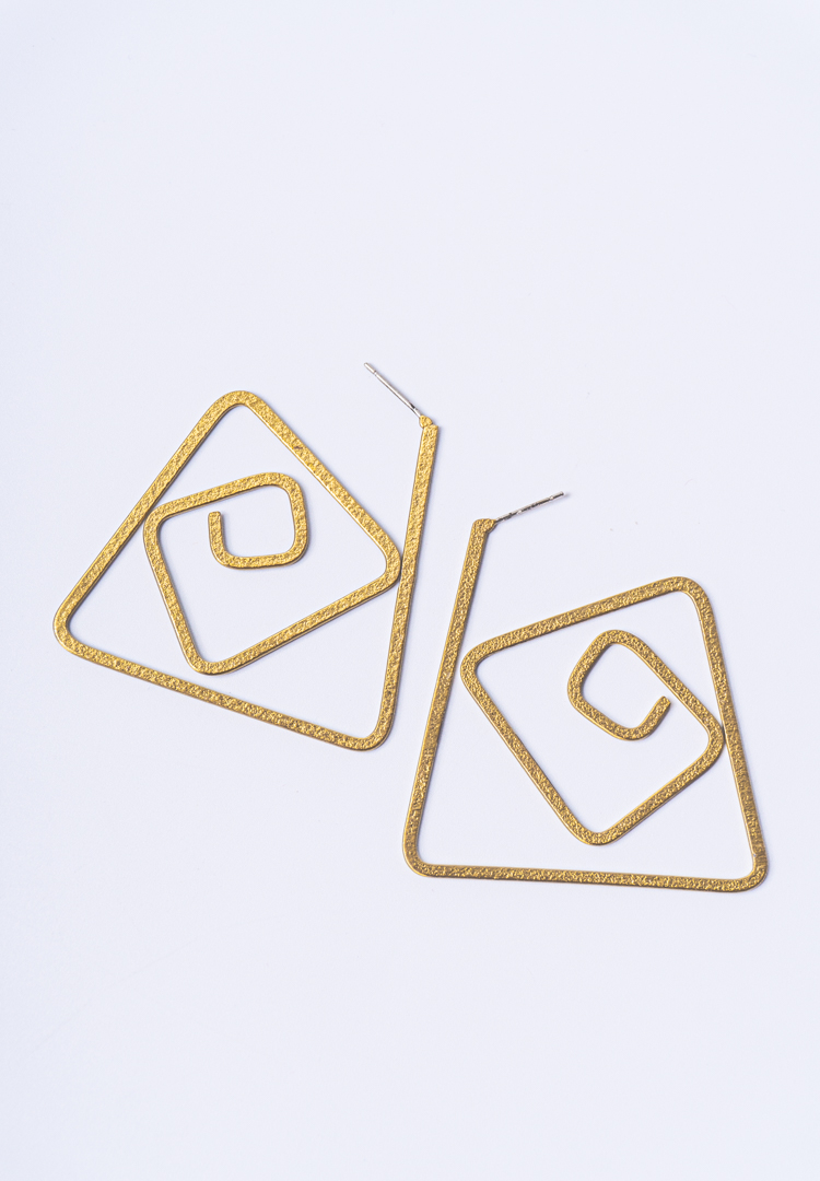 Geometric shaped abstract brass earring with textured finish and a push back post
