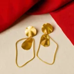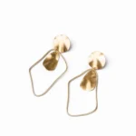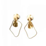 Brass earring with a slinging assymetrical irregular shaped hoop and a hammered teardrop shaped charm with a round hammered disc on the top and a push back post