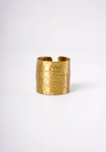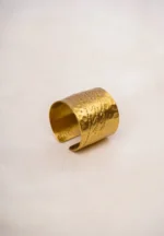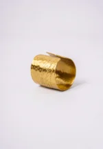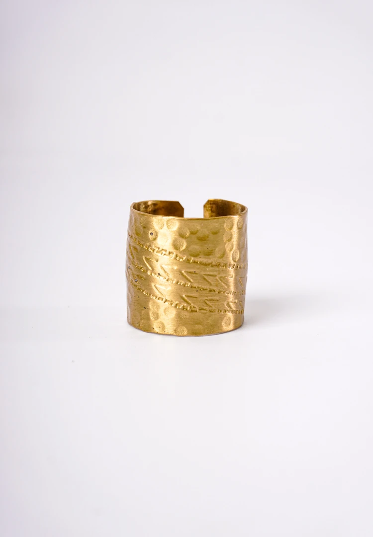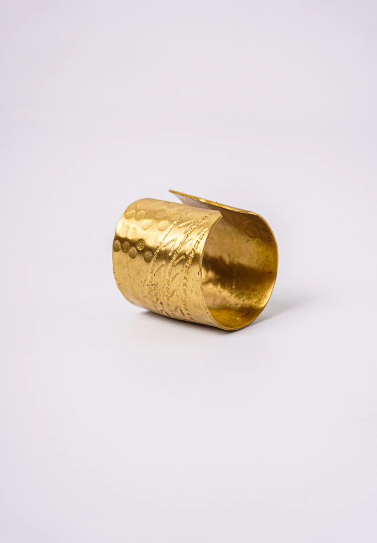 Elongated cylindrical ring with open emd and hammered textured gold-tone finish embellished with fine intricate detailing