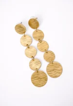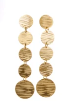 Dangle brass earring featuring a series of slinging five textured disc arranged vertically with a push back post