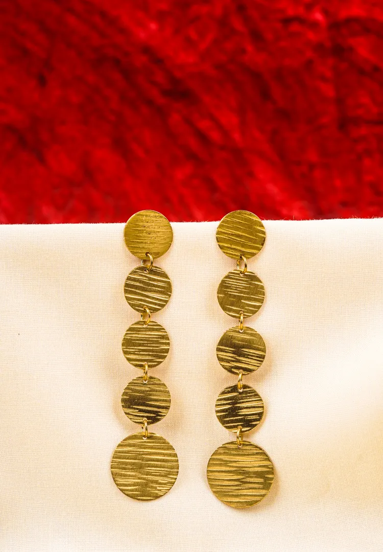 Dangle brass earring featuring a series of slinging five textured disc arranged vertically with a push back post