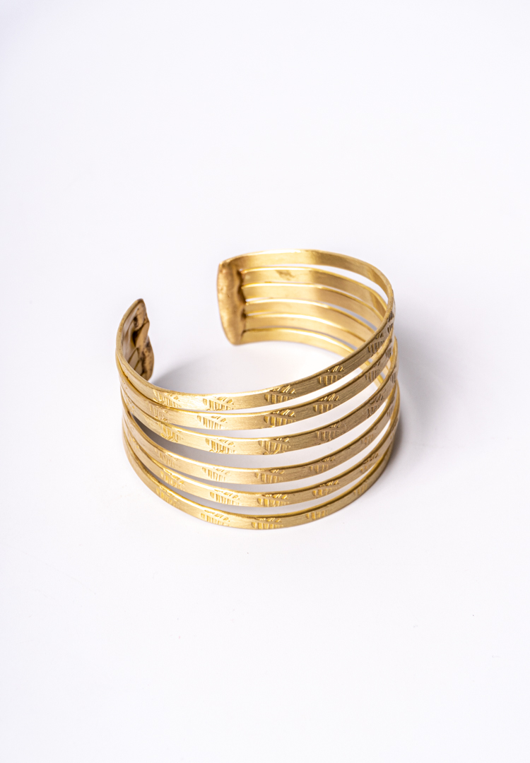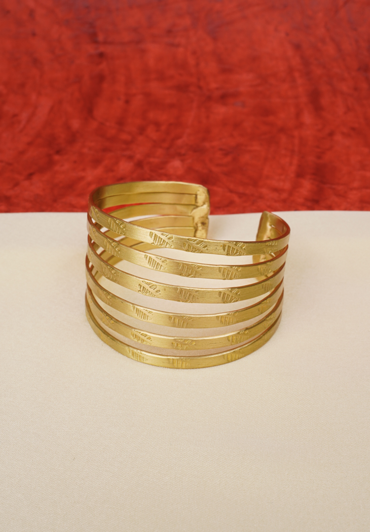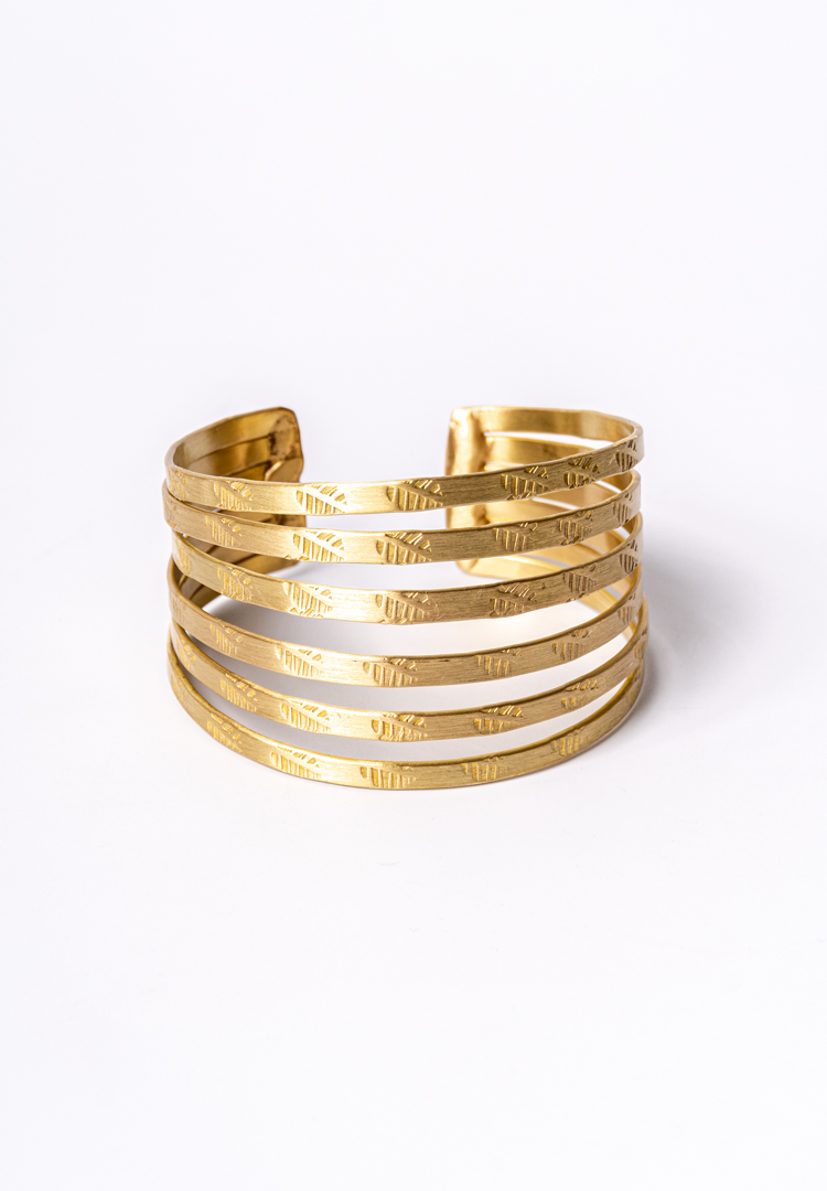 Metal cuff bracelet featuring multiple parallel bands adorned with subtle engraved leafy patterns with polished gold-tone finish