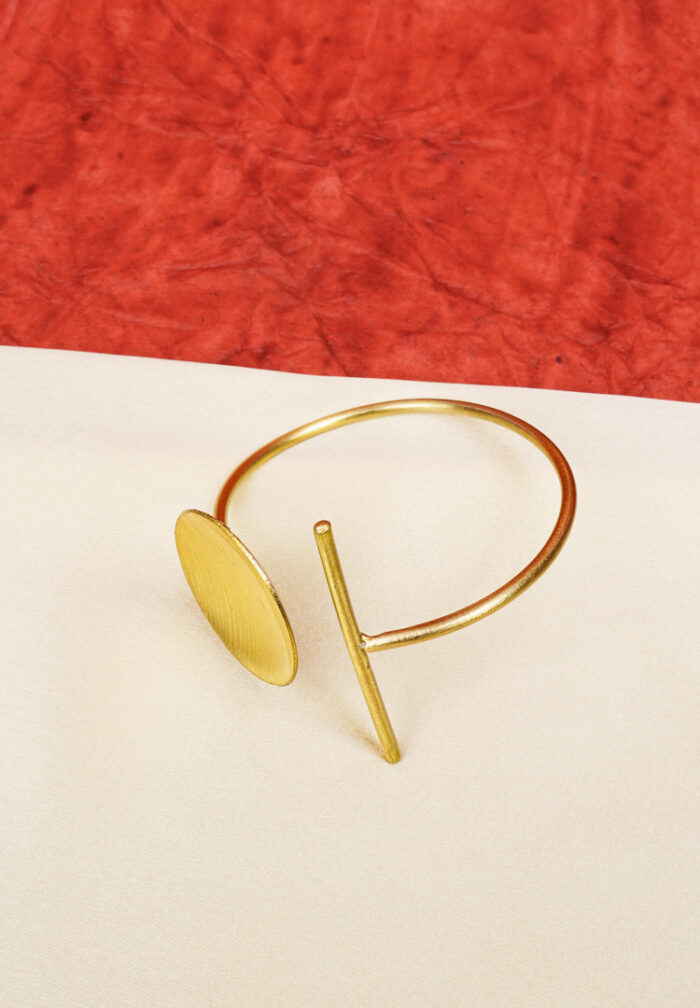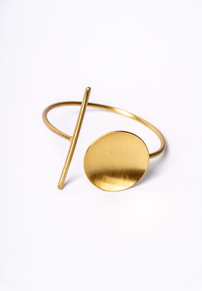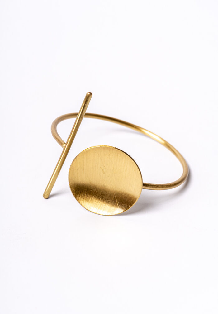 Geometric shaped metal open bangle with gold-tone finish featuring a brass finished circular disc and sleek vertical bar on the edged