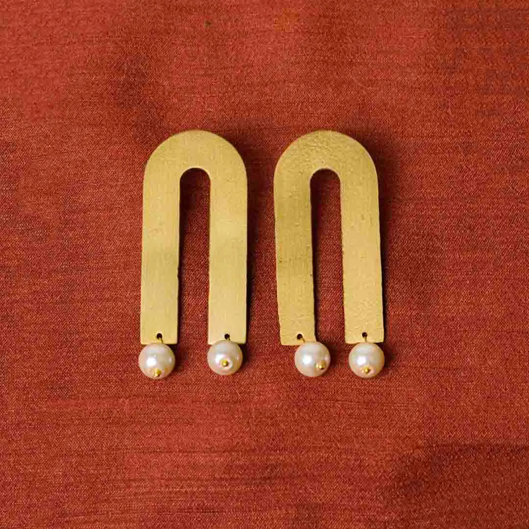 Brass U Shaped Pearl Drop Earrings