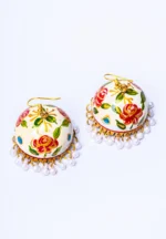 Jhumka earring with colourful floral meenakari detailing and gold-tone finish adorned with a series of small pearl beads at the edge and a french hook closure