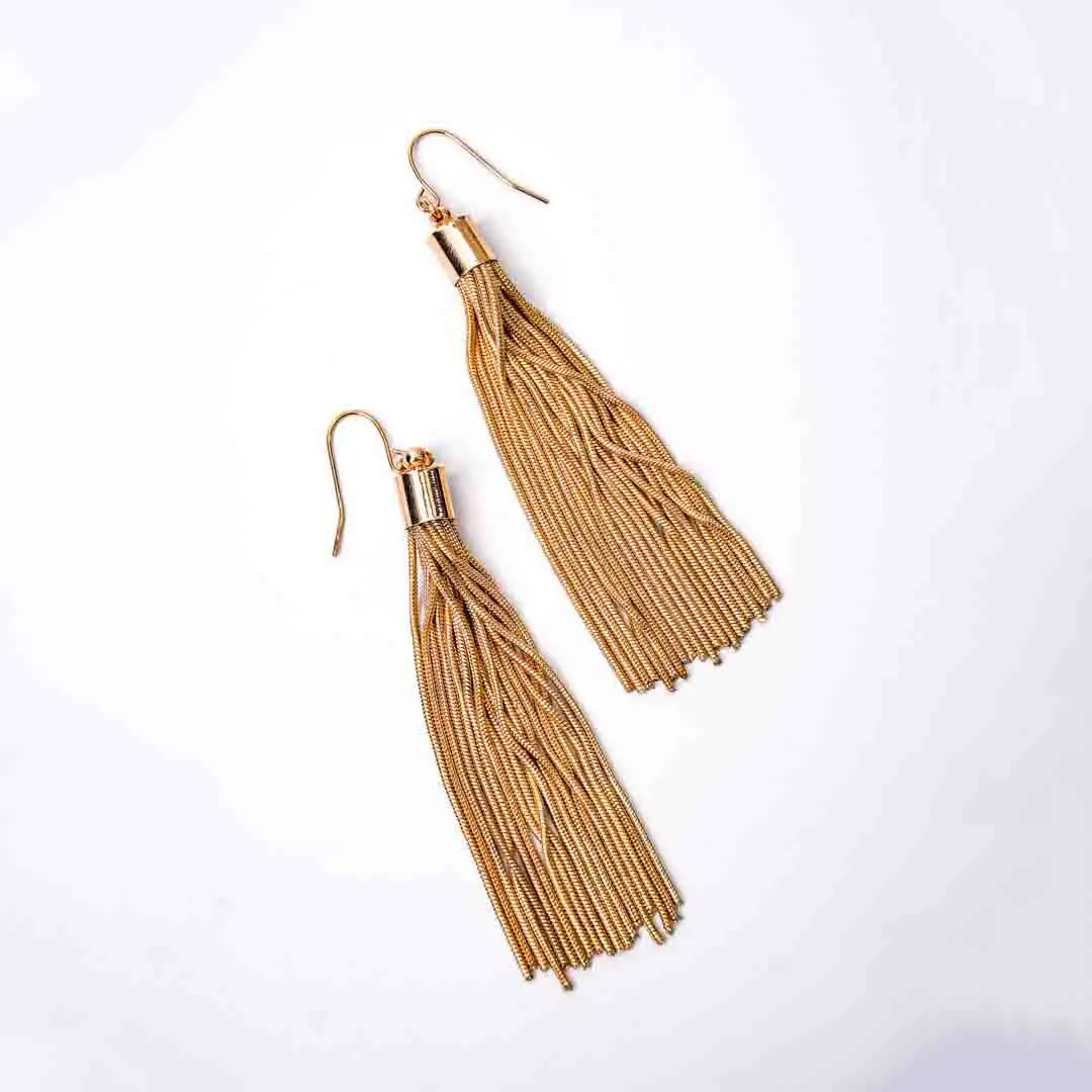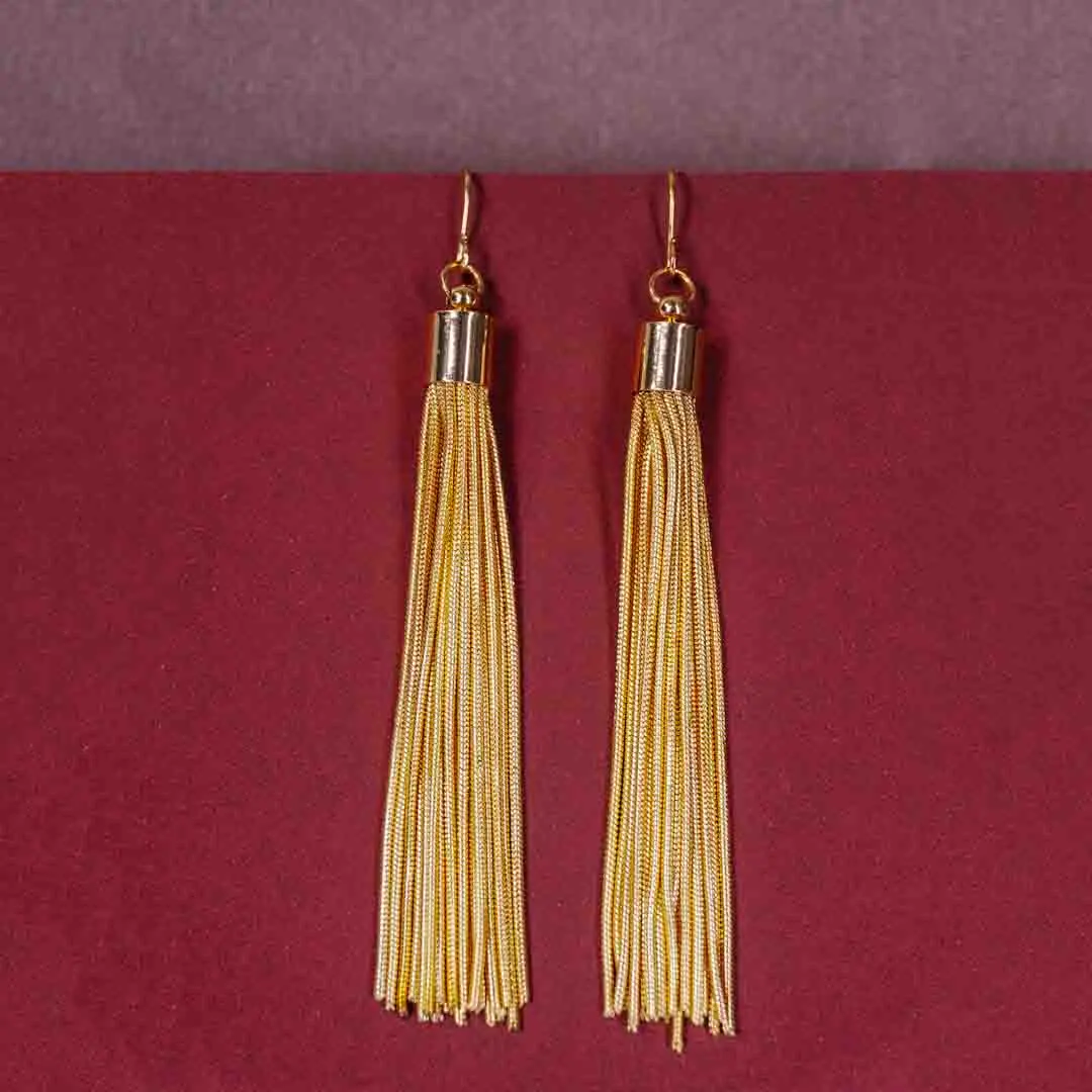 Gold-tone tassel earring with fine chain strands forming the tassel with a sleek cylindrical cap at top and push back closure