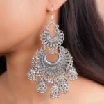 Metal dangle earring with fine detailing and oxidised silver tone finish featuring two dangling interconnected crescent shaped design adorned with small jhumka like designs and ghungroos with a french hook closure
