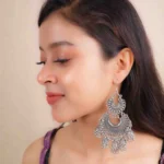 Oxidised jhumka earrings with complex floral detailing, featuring a finely detailedchain tassels, and ghungroos at the bottom, secured with a curved hook closure.