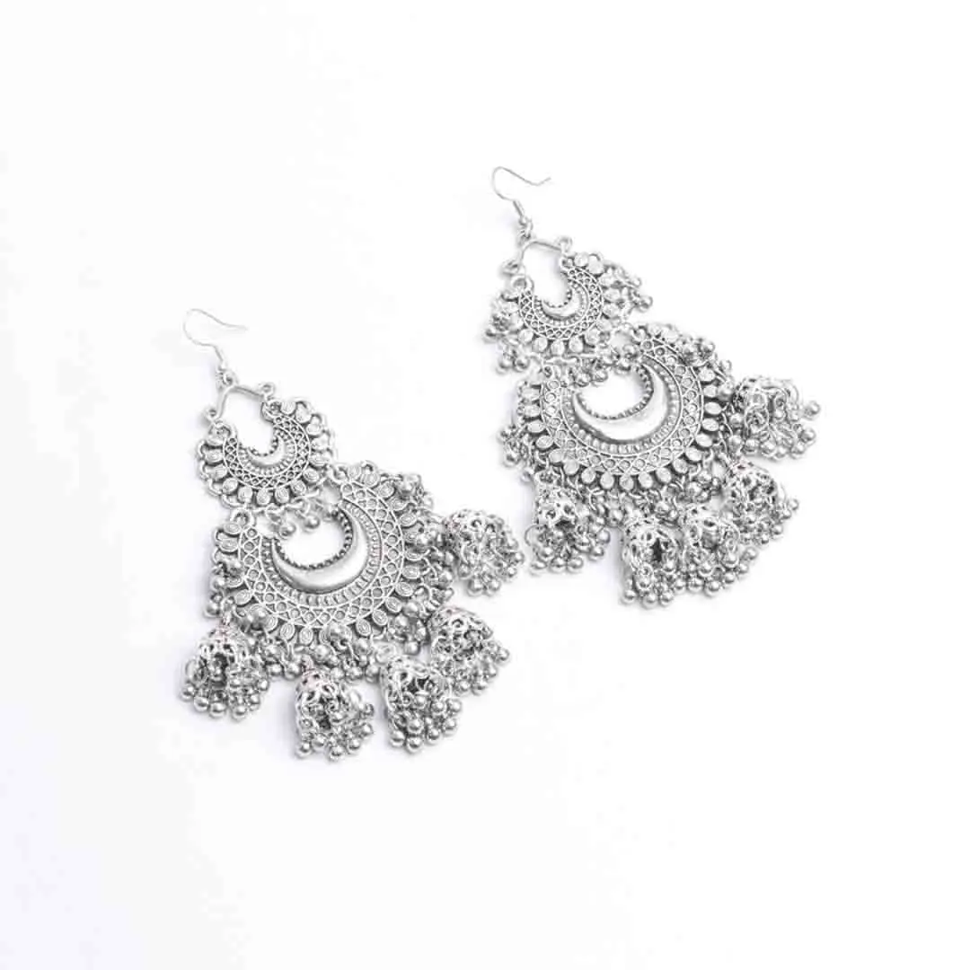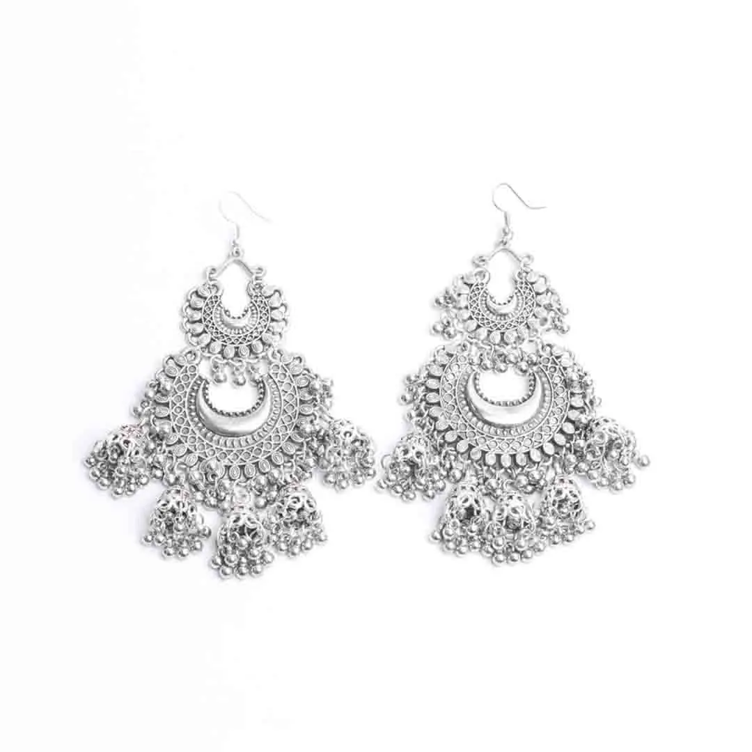 Metal dangle earring with fine detailing and oxidised silver tone finish featuring two dangling interconnected crescent shaped design adorned with small jhumka like designs and ghungroos with a french hook closure