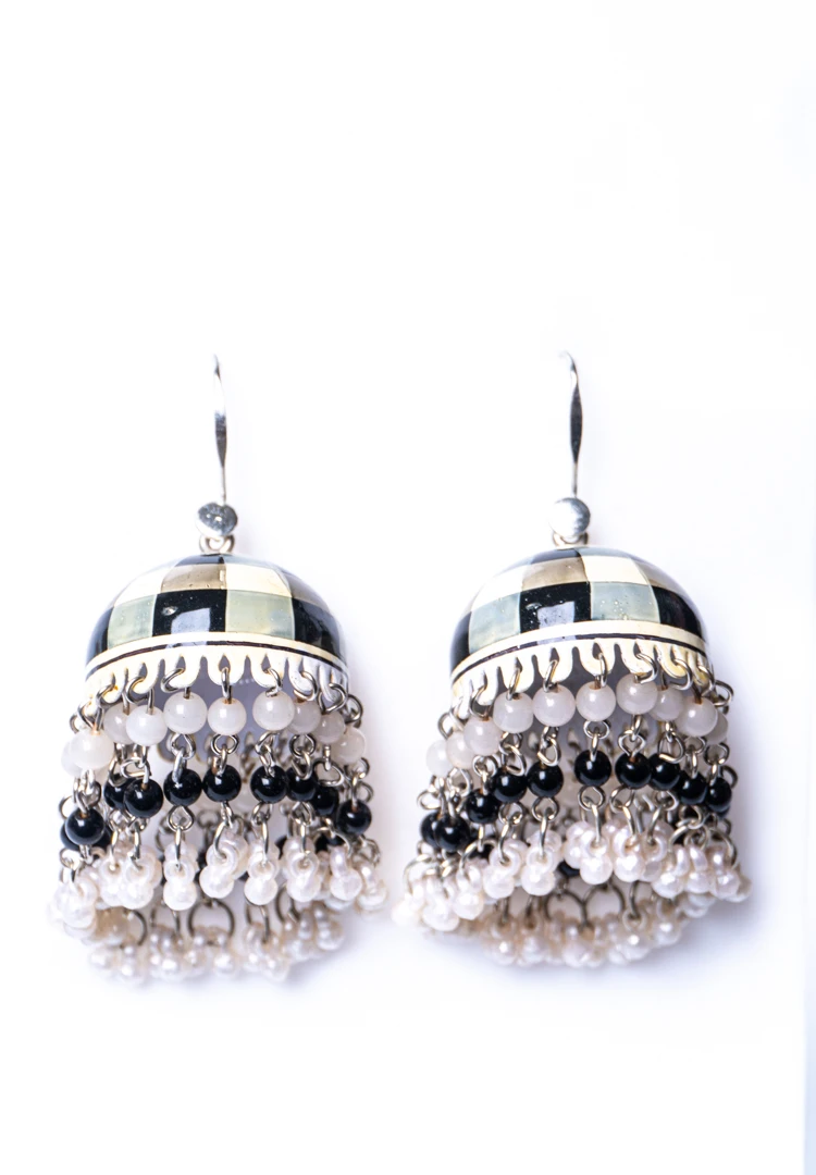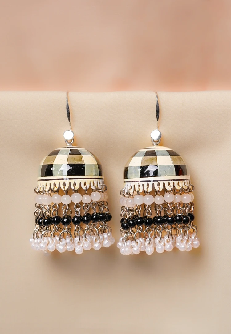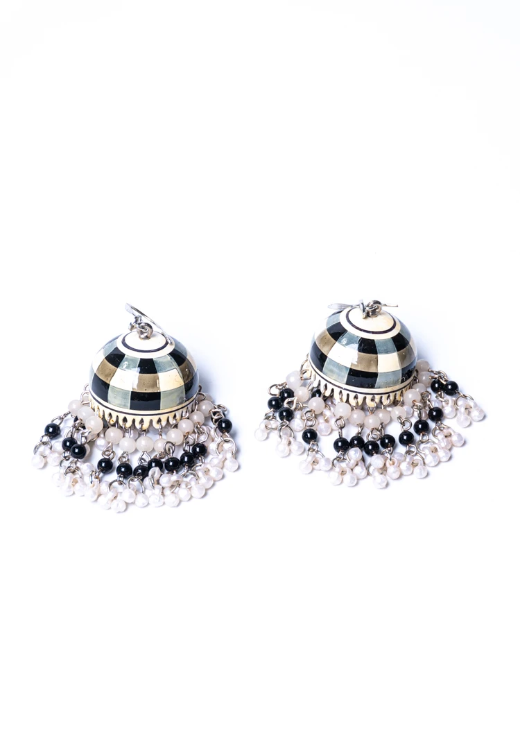 Jhumka earring with fine meenakari detailing and silver-tone finish featuring geometric patterns and fine chain tassels adorned with evenly spaced white and black coloured beads with small circular pearl beads at the bottom and a french hook closure