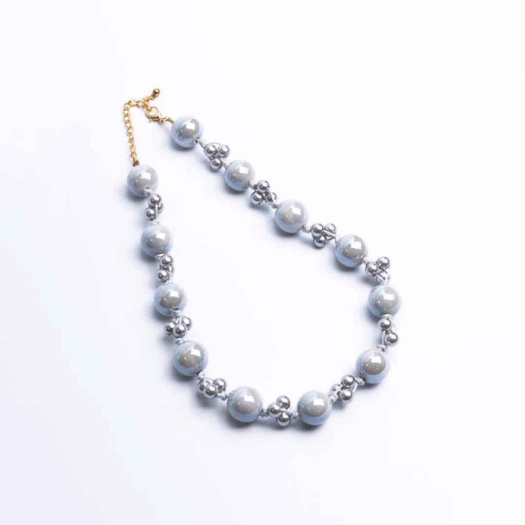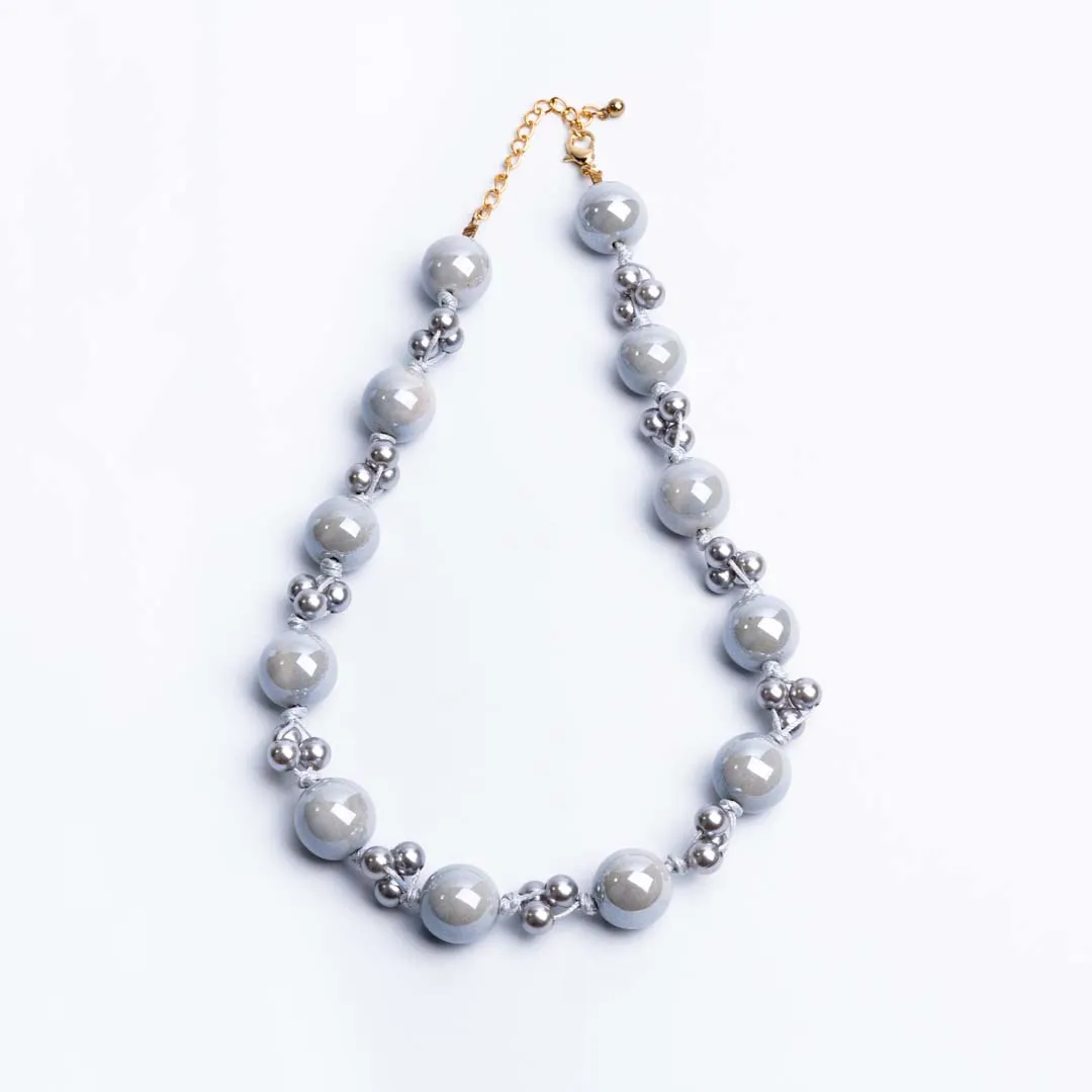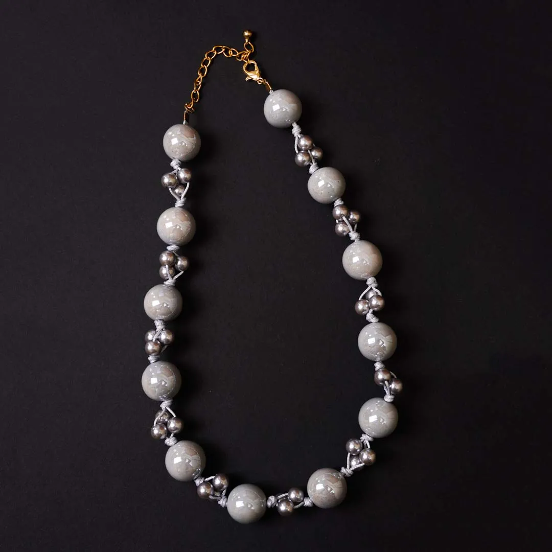 Beaded necklace with golden tone/grey coloured finish featuring round Shaped grey coloured beads and a lobster claw clasp