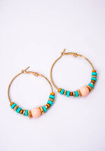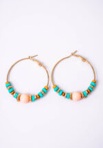 Metal hoop earring with golden tone/turquoise, light pink finish featuring turquoise gold and wooden beads along with a soft pink coloured bead in the centre and a hinged back