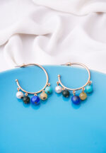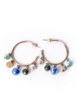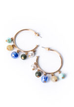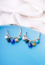 Metal c hoop earring with golden tone multicolor finish adorned with circular textured turquoise,blue,yellow,green and pearl beads with a push back closure