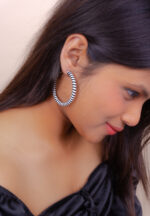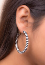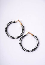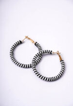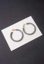 Metal hoop earring wrapped with black and white stripped patterned thread and a golden hinged back