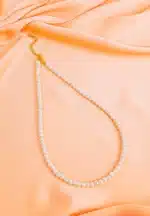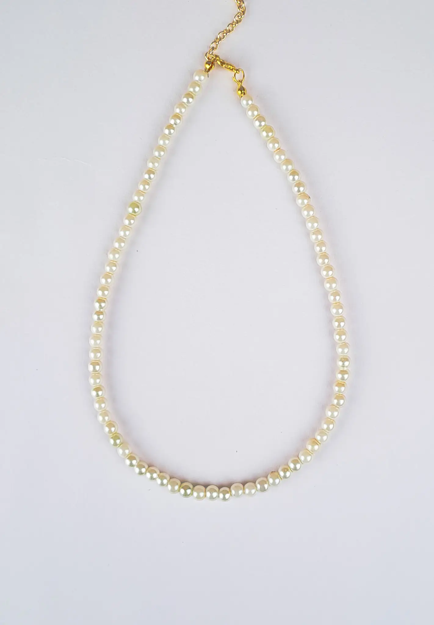 Single-row glass pearl bead necklace with a lustrous, polished finish and gold-tone adjustable lobster clasp closure. The design is minimal and timeless, radiating classic elegance and versatility for any occasion, whether worn solo or layered.