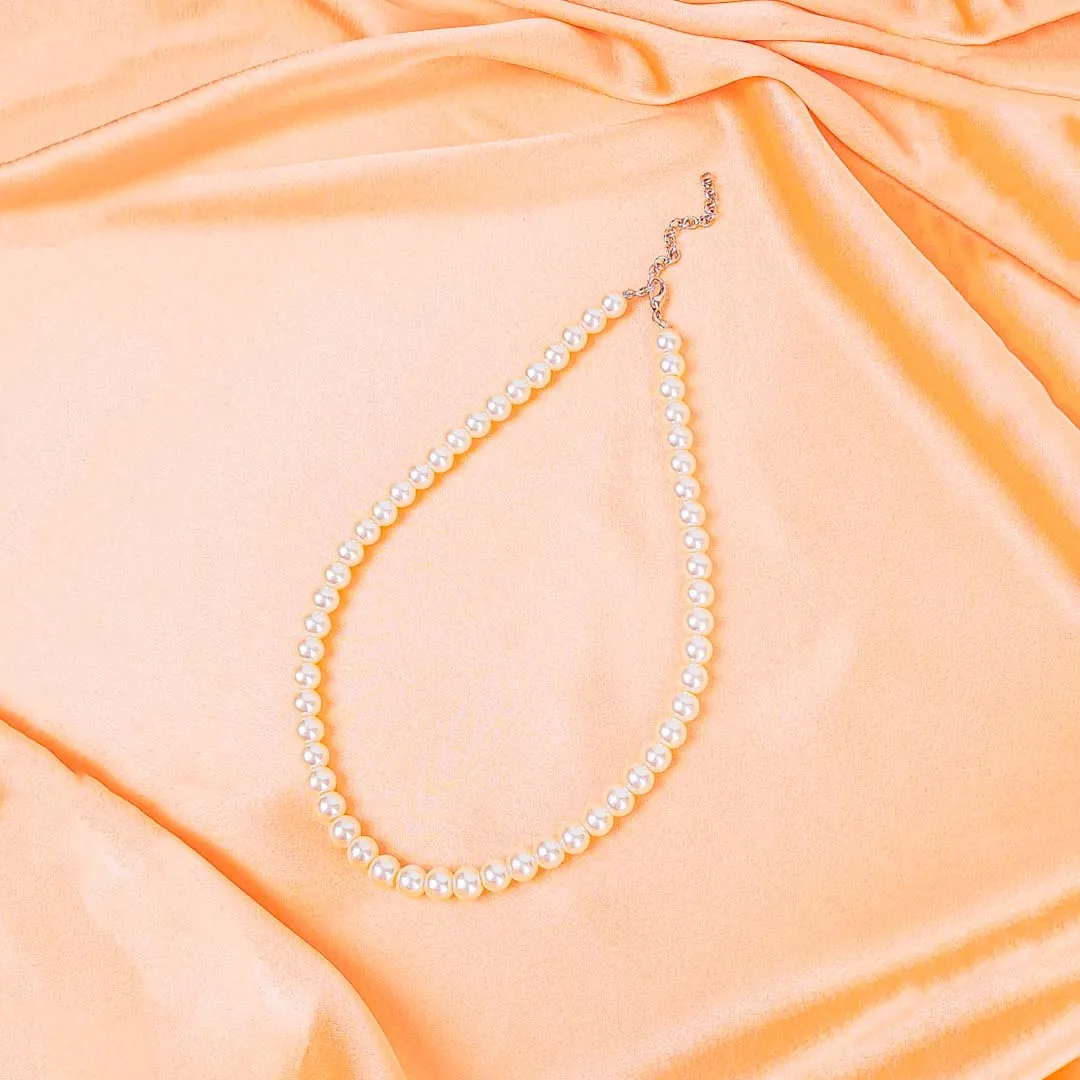 Vintage pearl beaded necklace featuring round ivory-toned shell pearls, meticulously strung for a graceful drape. The necklace showcases a smooth, lustrous finish and is secured with a polished silver metal lobster clasp. Designed for timeless elegance.