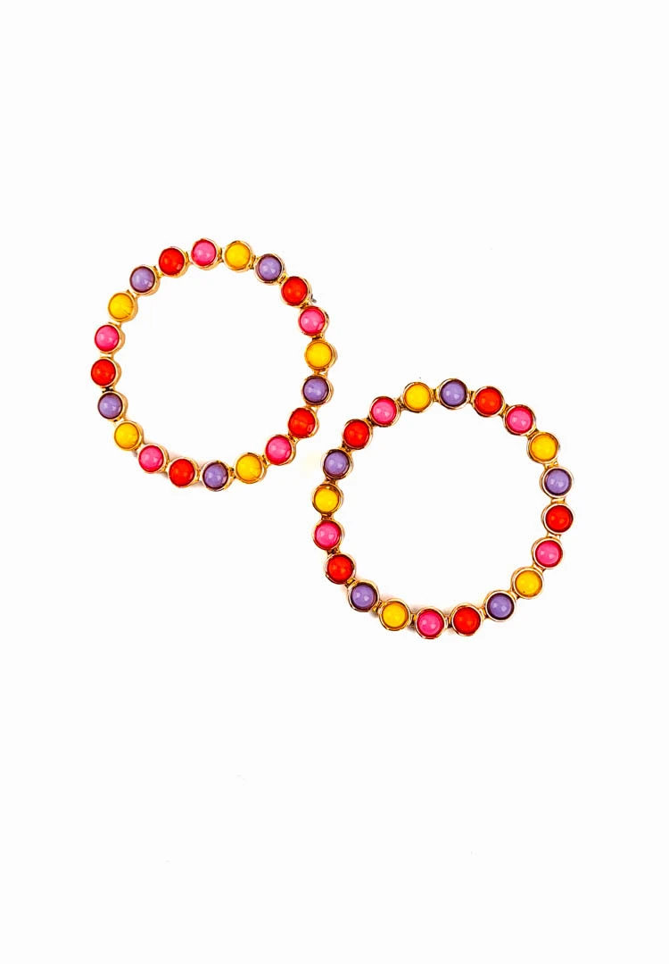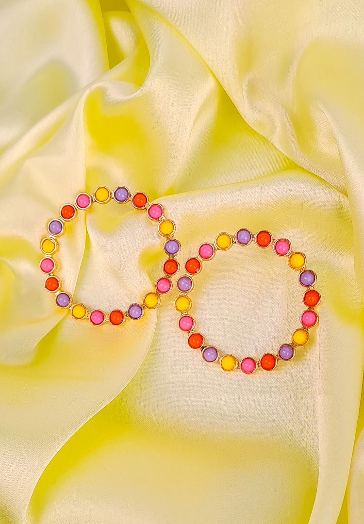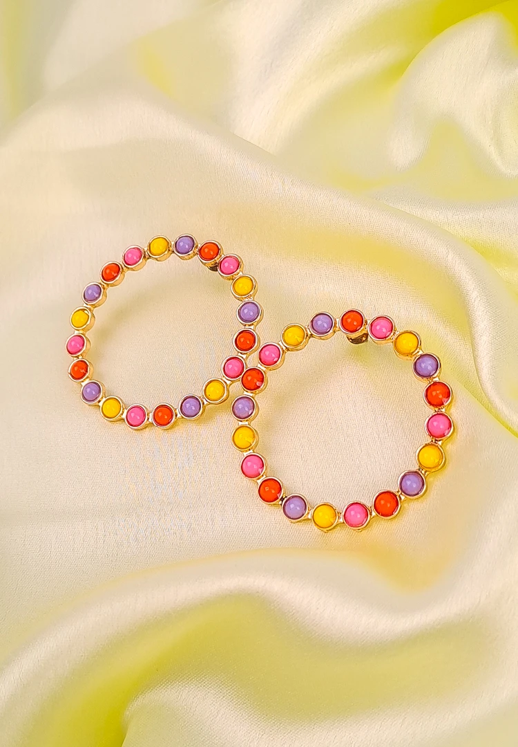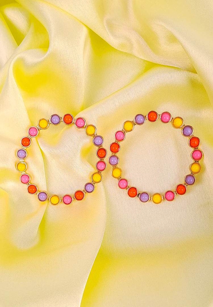 Vibrant round hoop earrings adorned with multicolor enamel beads in pink, yellow, purple, and orange tones. Designed in smooth polished finish, these lightweight hoops bring a playful yet chic statement to any look. Push-back closure ensures easy and secure wear.