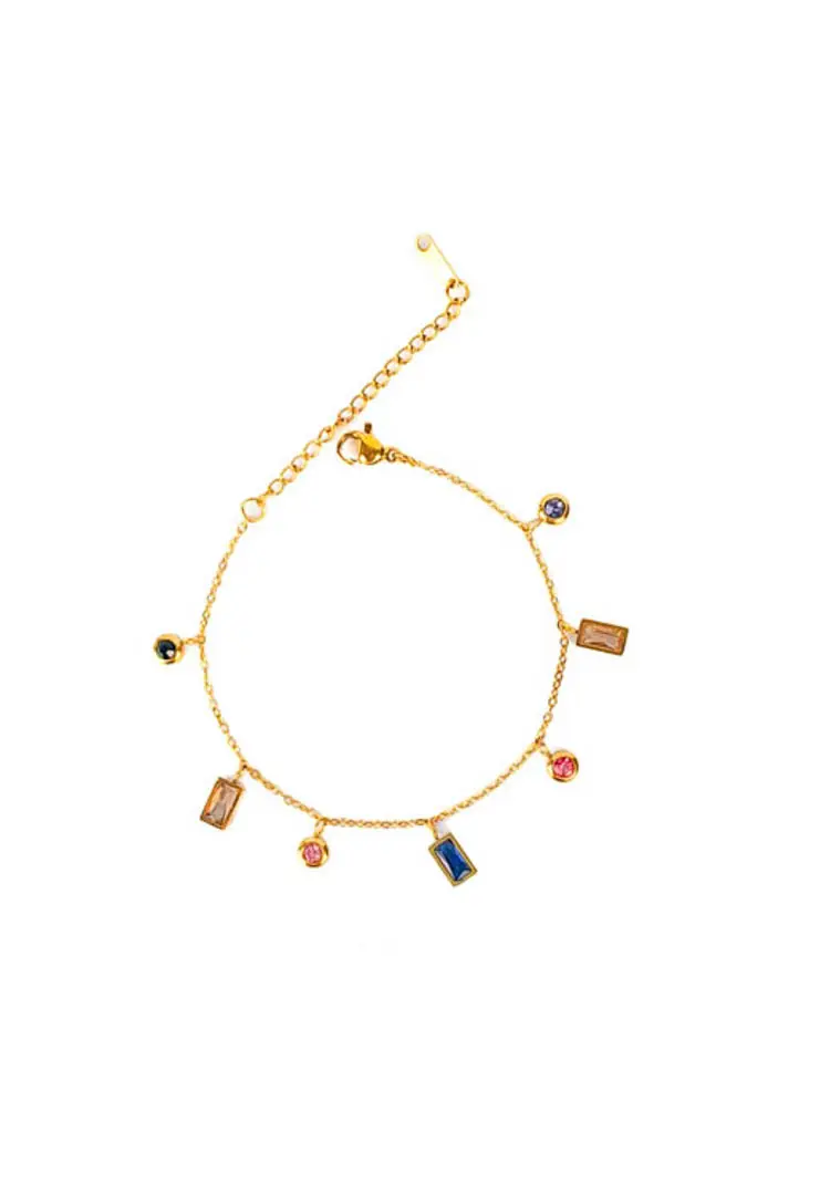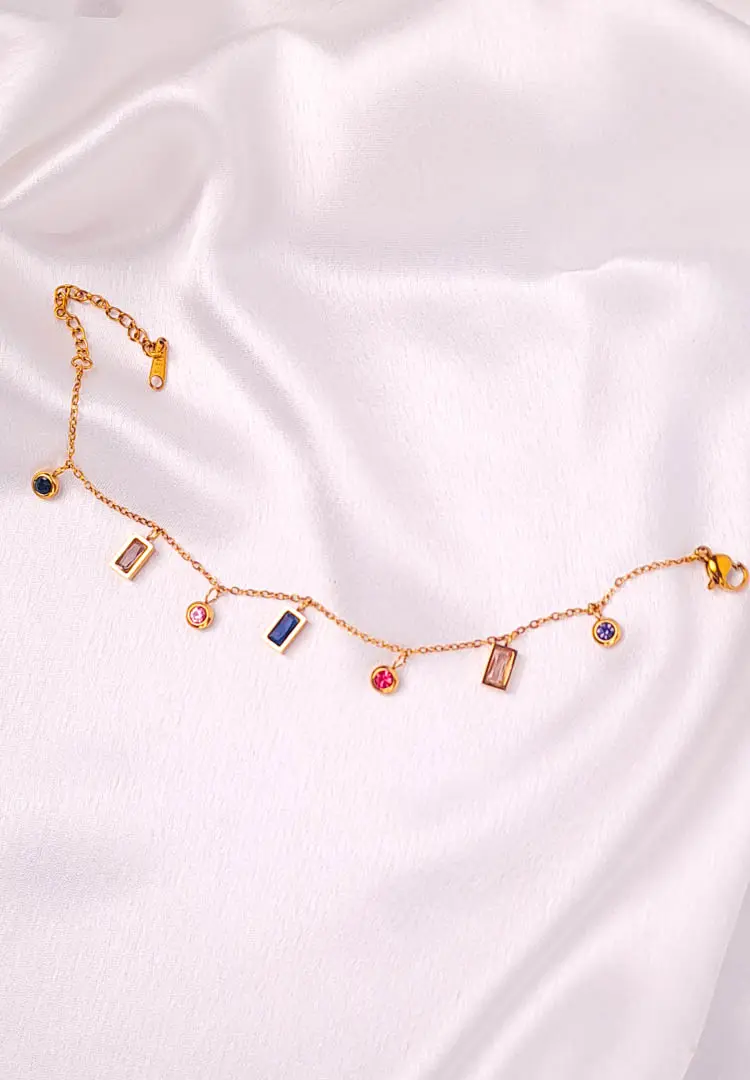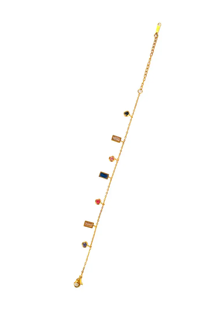 Delicate gold-tone bracelet with rectangular enamel and tiny gem charms, crafted in a polished stainless steel chain. Features adjustable extender and lobster clasp for a playful, modern accent with glossy, colorful details.