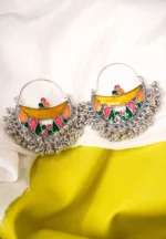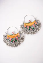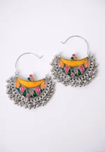 Geometric shaped metal drop earring with oxidised silver-tone finish featuring crescent shaped element adorned with geometric patterns and colourful enamel inlays with dangling ghungroos at the bottom and a hinged back