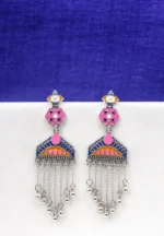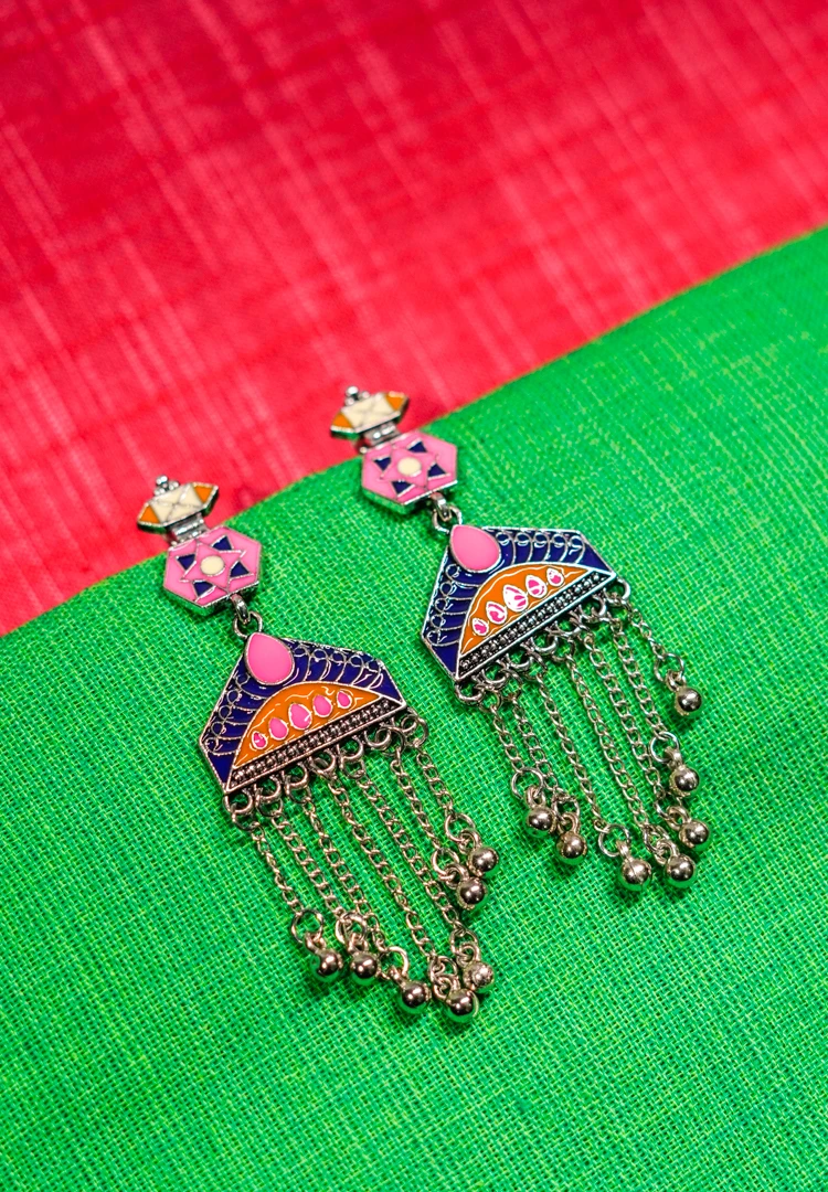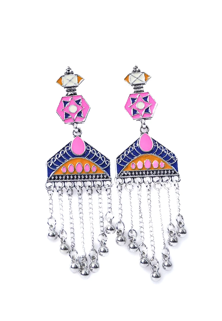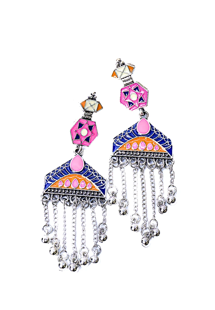 Geometric shaped metal dangle earring with fine deatiling and antique silver-tone finish adorned with colourful enamel inlay and dangling chain tassels with circular beads and push back closure