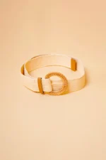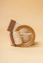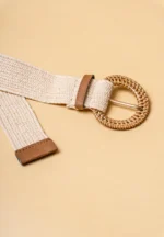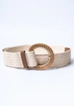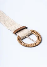 Textured woven straw belt in cream colour featuring a woven circular shaped buckle