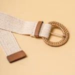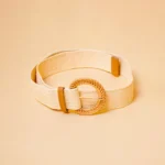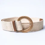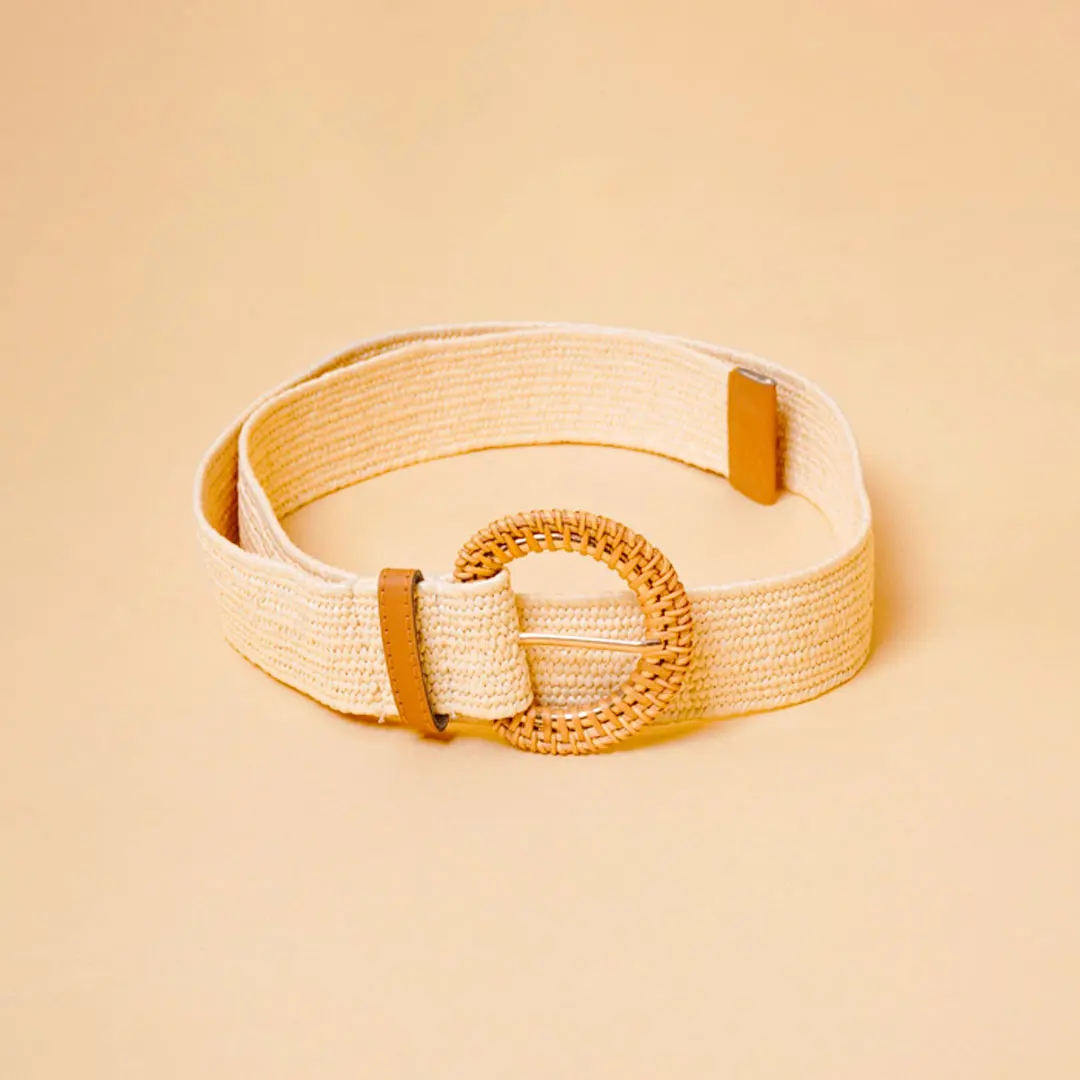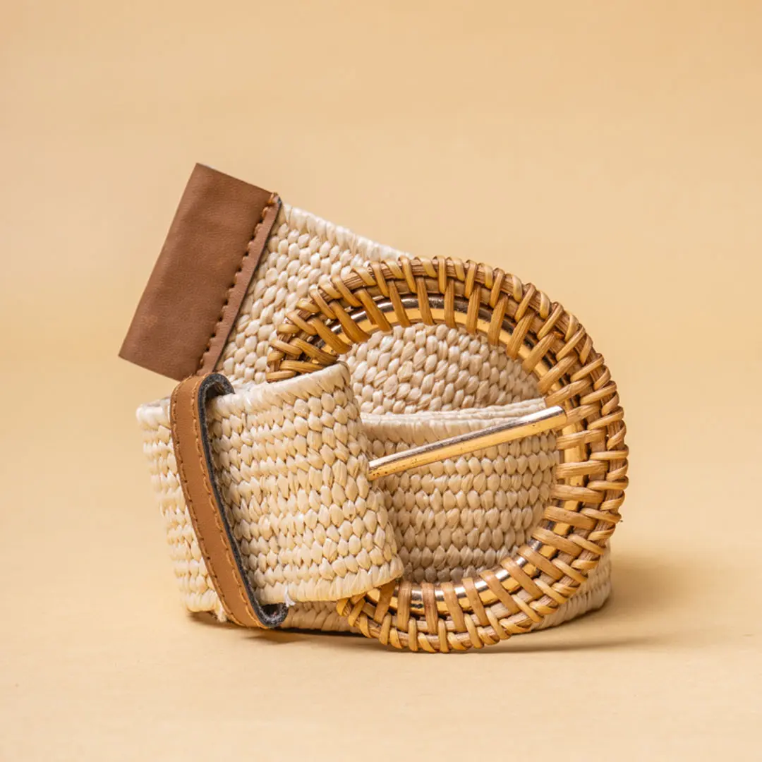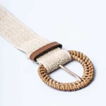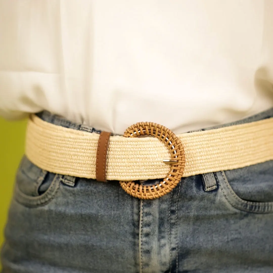 Textured woven straw belt in cream colour featuring a woven circular shaped buckle